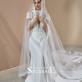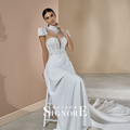 Abito da sposa scivolato con corpino scollo a v profondo arricchito da cristalli. La gonna in crepe ha una coda ampia con inserti di pizzo e cristalli che riprende il corpino