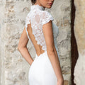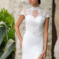 Abito da sposa dalla linea scivolata realizzato con morbida gonna in georgette e corpino geometrico, in pizzo finissimo, colletto alto e sensuale scollatura sulla schiena.