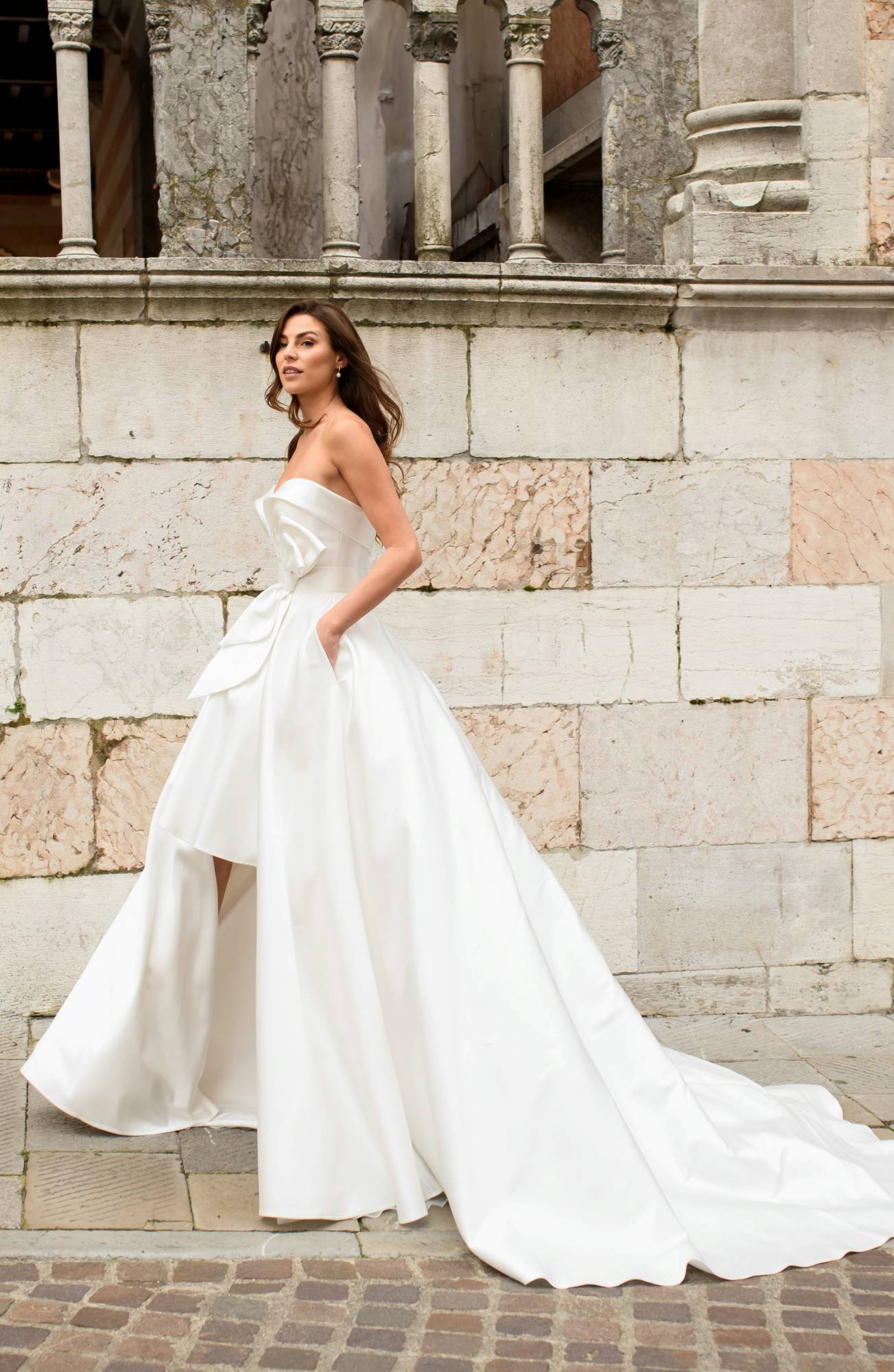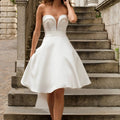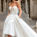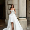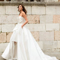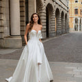 Abito corto in mikado con scollo a cuore abbinato a sopragonna aperta ampia, un abito trasformabile perfetto per la sposa che vuole sorprendere.