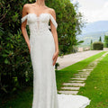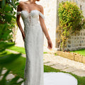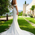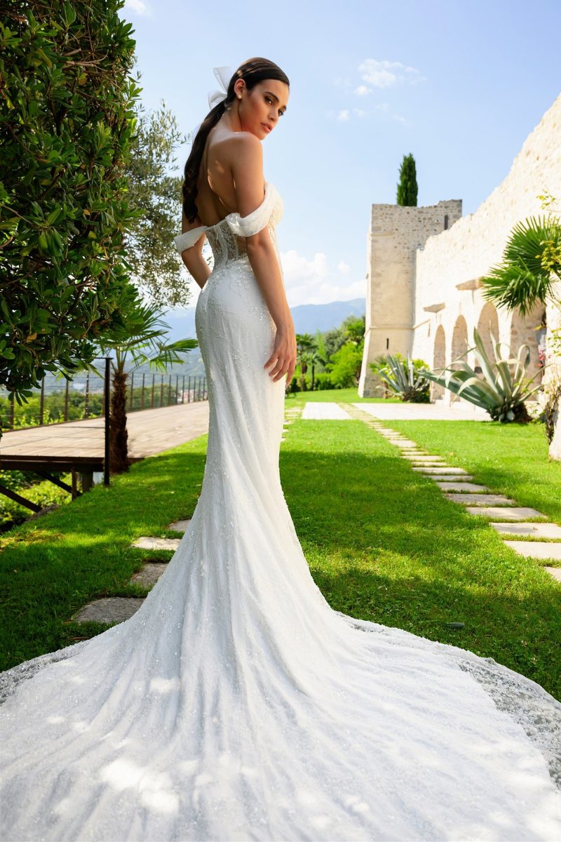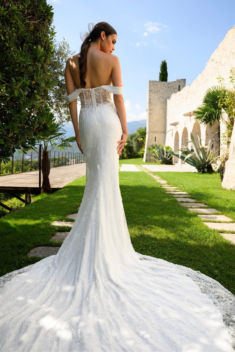 Abito da sposa a sirena con corpetto effetto corsetto steccato con sensuali trasparenze, spalline omerali e bottoncini sulla chiusura della schiena. L'abito è realizzato in tulle morbido con applicazioni sparse di ricamo luminoso.