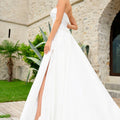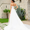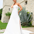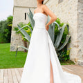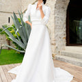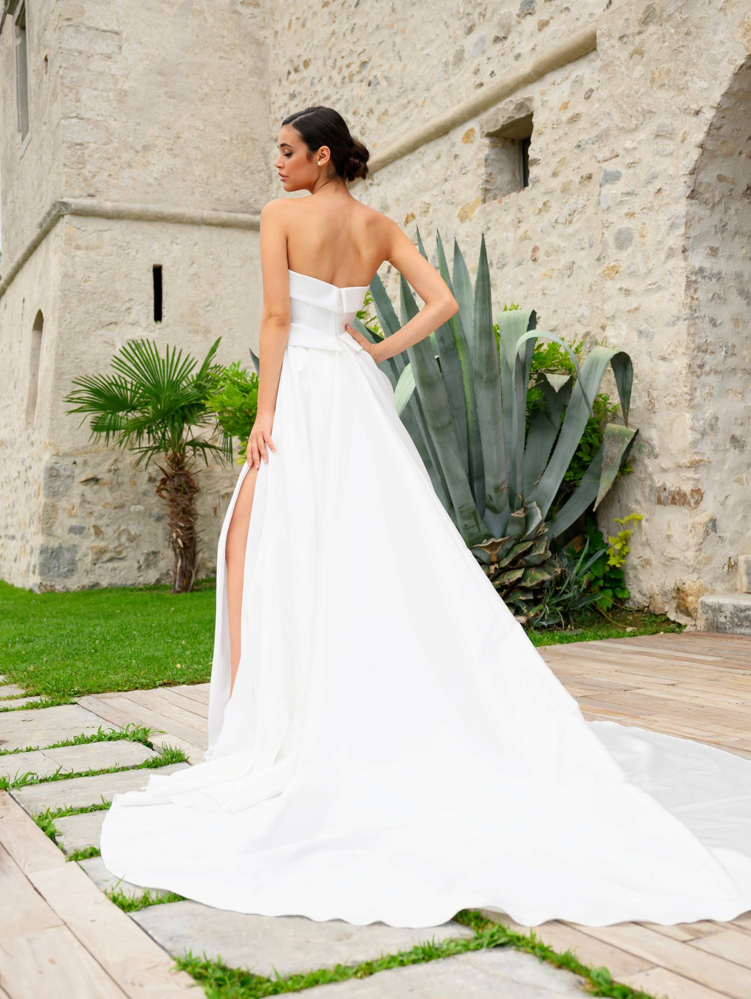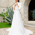 Abito da sposa dalla linea semi ampia con fascia alta e scollo dritto con bavero. In abbinamento un bolero effetto blazer con maniche lunghe, bavero e colletto.