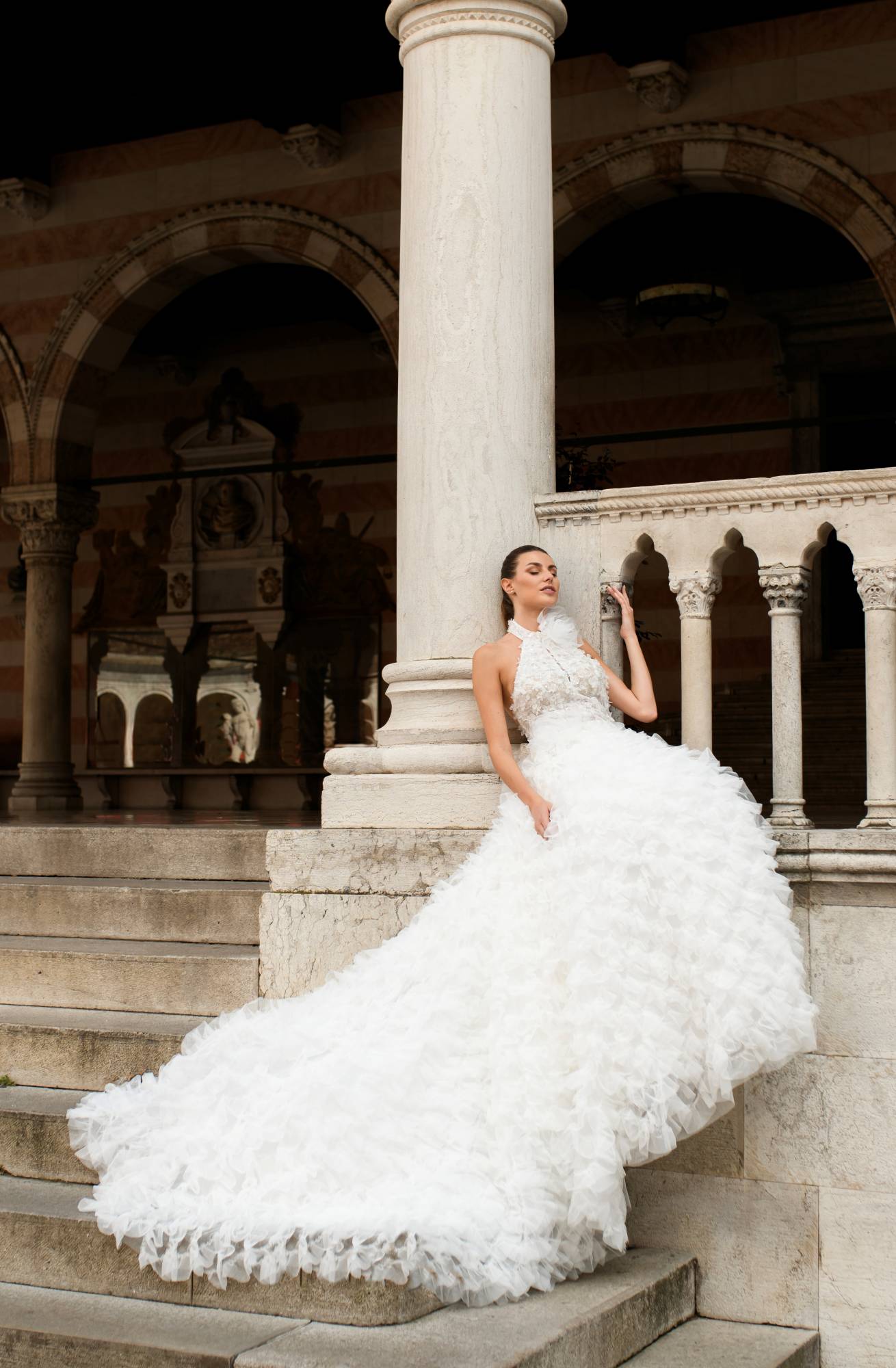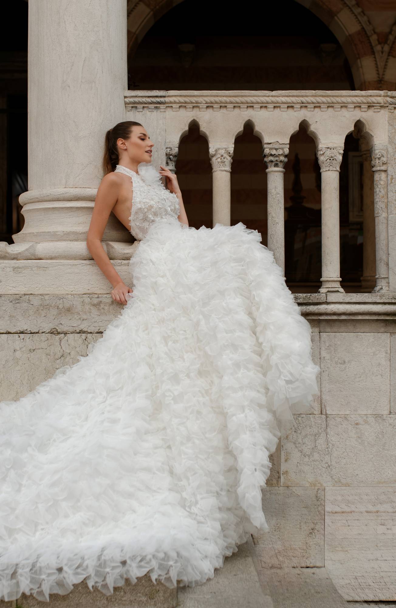 Monumentale sopragonna in tulle con balze e strascico scenico. Da abbinare a sirene o corti sfiziosi.