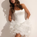 Abito composto formato da corsetto steccato con scollo dritto e gonna in tulle a balze che rende l'abito moderno.