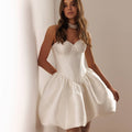 Abito corto di mikado con corpetto steccato e scollo a cuore senza spalline. La gonna a palloncino dona un tocco di romanticismo e modernità all'abito.