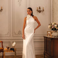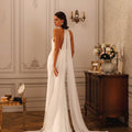 Abito da sposa a sirena in crepe con scollo all'americana e ali. La gonna è pulita e liscia con piccola coda.
