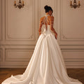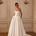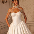 Abito da sposa principesco completamente in mikado con gonna ampia e corpino a bustino strutturato con scollo a cuore senza spalline. la collana a collarino con pendenti sulle spalle è arricchito da perle di diverse dimensioni