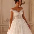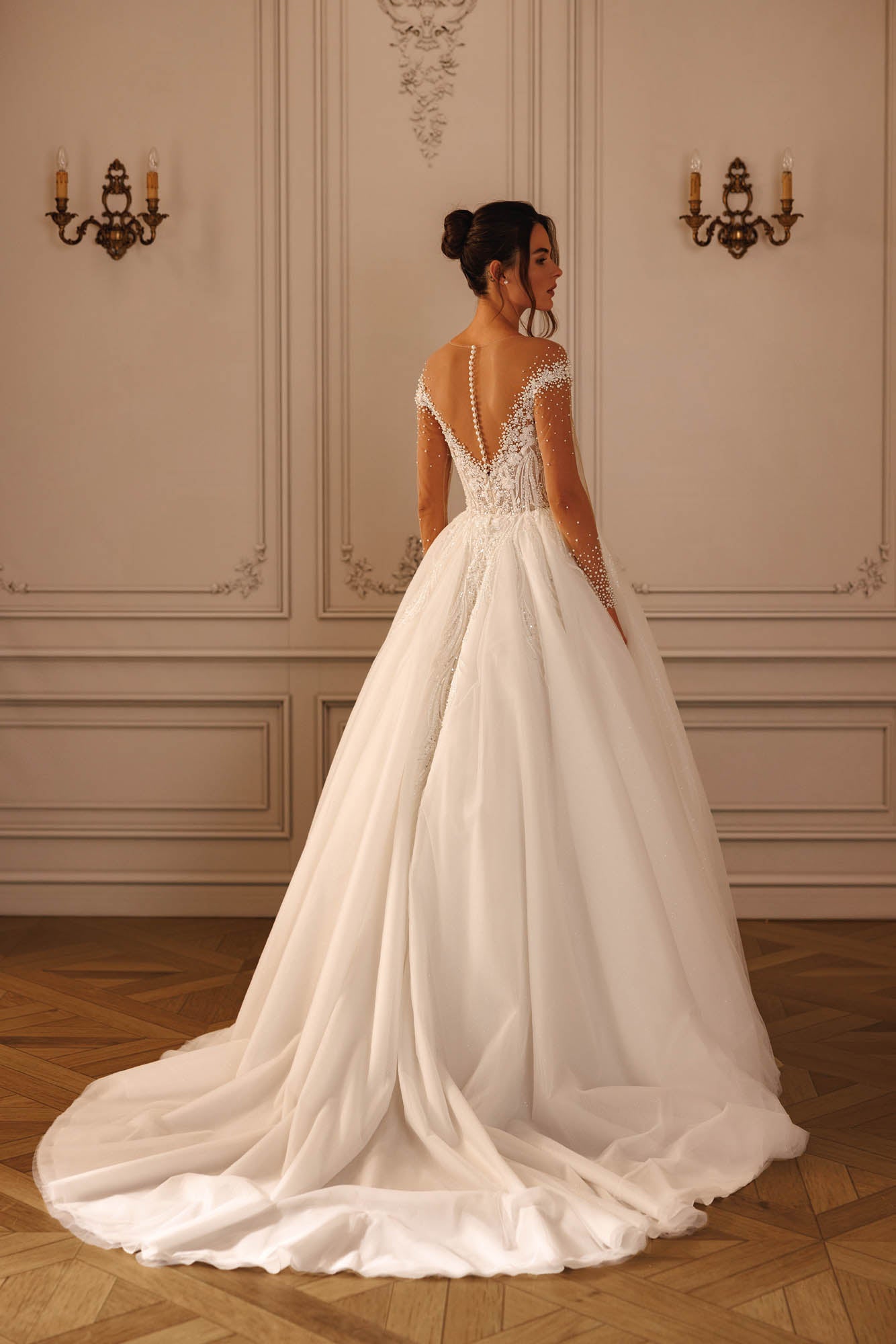 Abito da sposa principesco con corpino semitrasparente con stecche a vista, ricami floreali e perle di varie dimensioni che ricoprono anche le maniche lunghe.