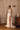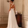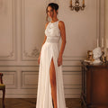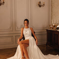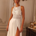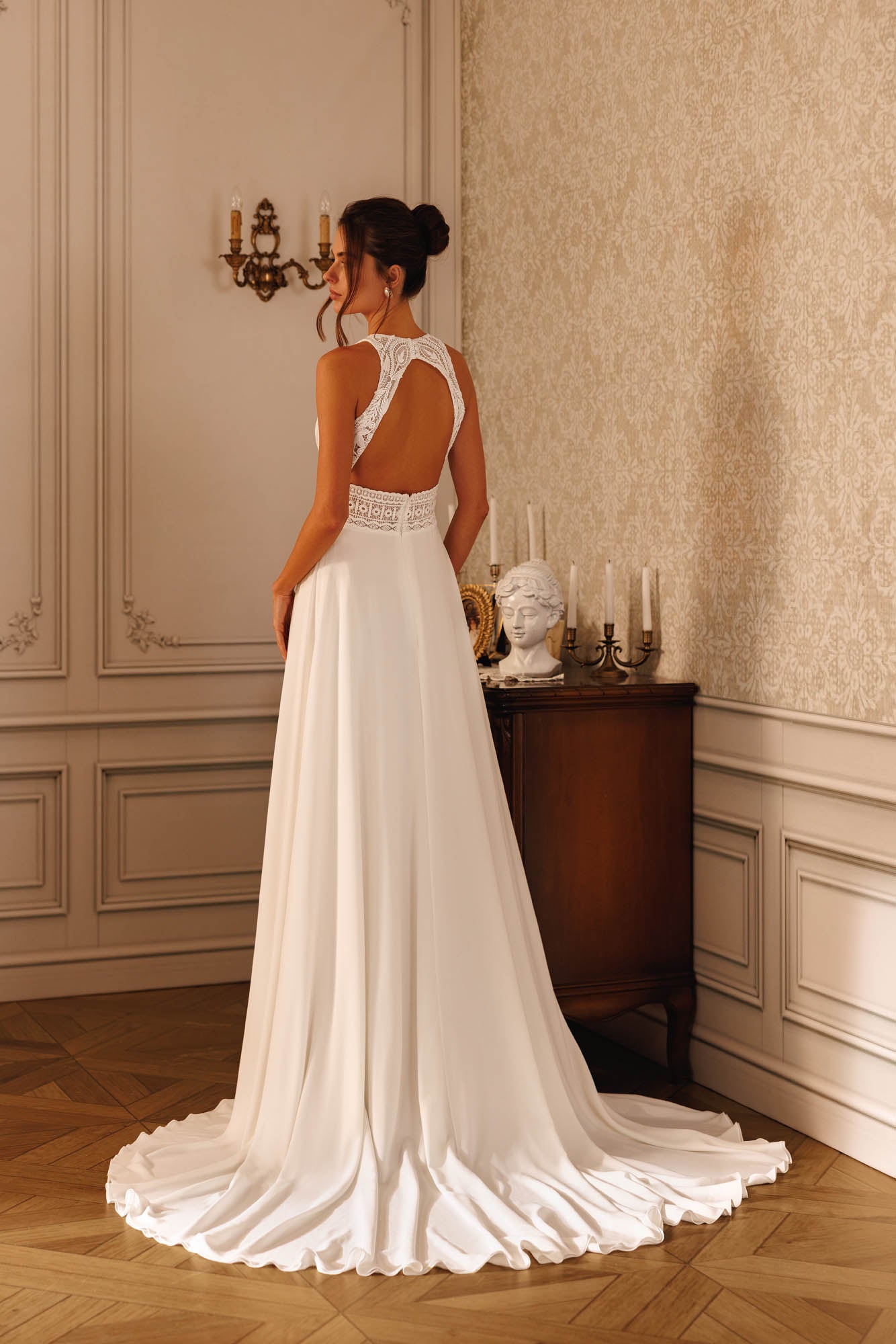 Abito da sposa scivolato con gonna morbida e spacco profondo laterale. Il corpino è in pizzo semitrasparente effetto foglia con scollo all'americana e cintura con disegni geometrici.