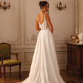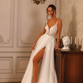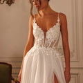 Abito da sposa scivolato con gonna in tulle con spacco laterale arricchito da inserto di pizzo floreali che riprendono anche sul corpino semitrasparente con stecche a vista, scollo a V e sottili bretelline gioiello