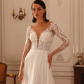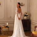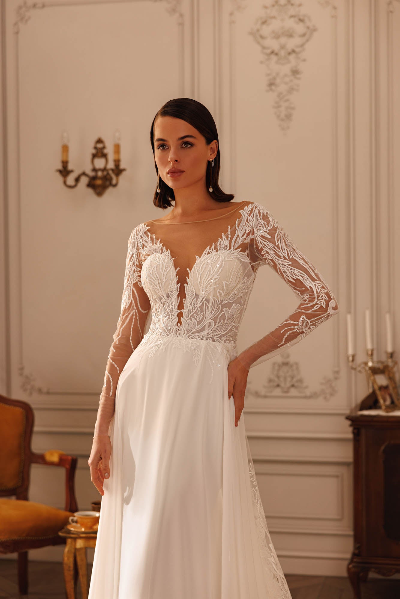 Abito da sposa scivolato con gonna in georgette morbida e corpino semitrasparente con inserti di pizzo riprese anche sulle maniche lunghe e sulla coda dell'abito. La schiena è finemente decorata con effetto illusione che dona sensualità.