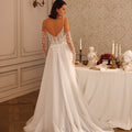 Abito da sposa scivolato con gonna in tulle e spacco laterale arricchita da inserti di pizzo che riprendono quelli del corpino con scollo quadrato e sottili bretelline. il guanto in tulle riprende il pizzo del vestito