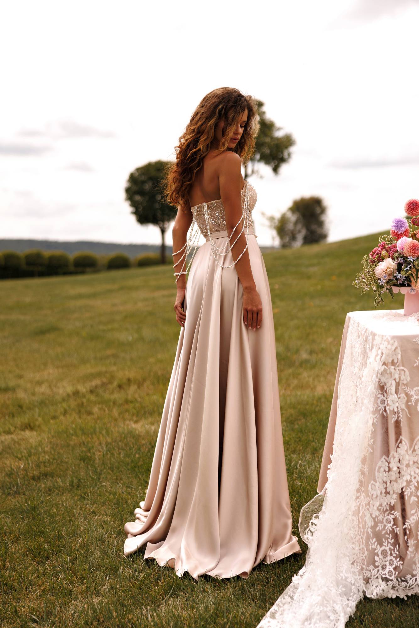Abito dalla linea scivolata con corpino scollato a cuore e finemente ricamato con perline e cristalli. La gonna, in morbido raso color rosa cipria, presenta un sensuale spacco laterale. Completano il look delle spalline gioiello che cadono morbide lungo le braccia.
