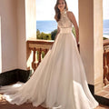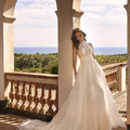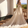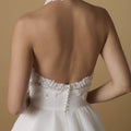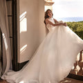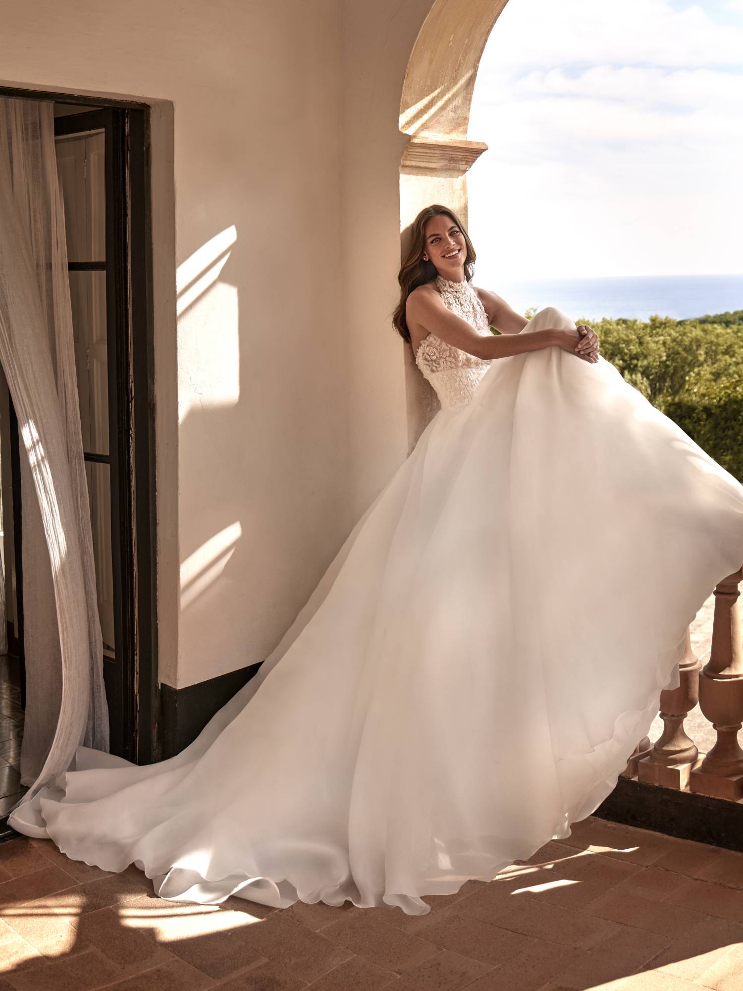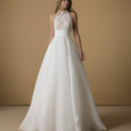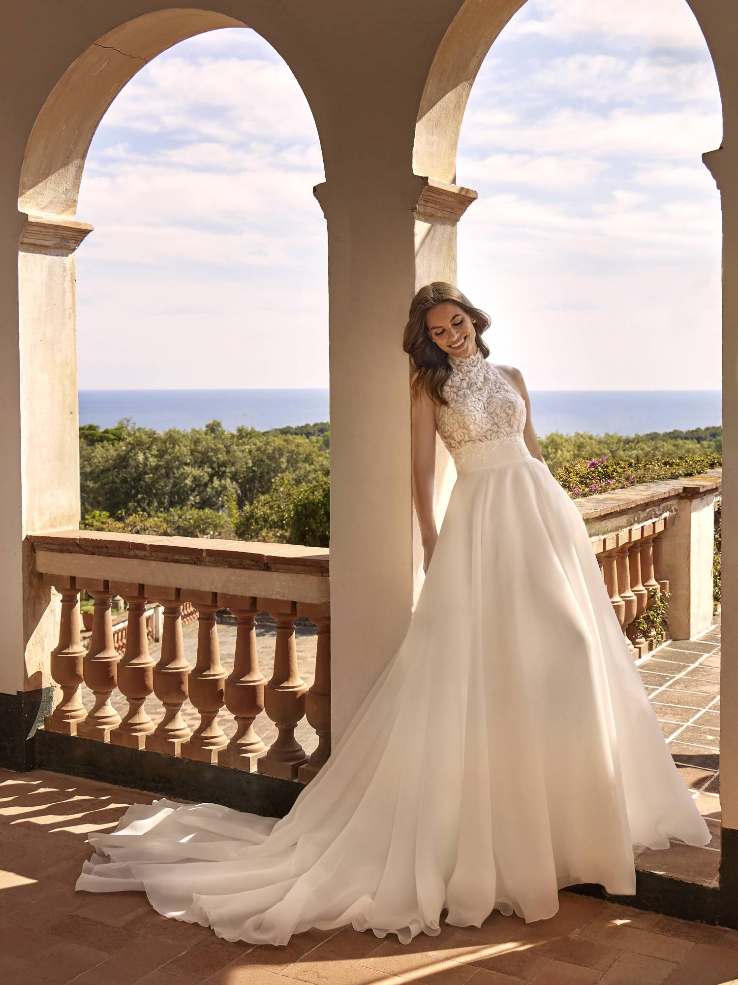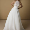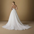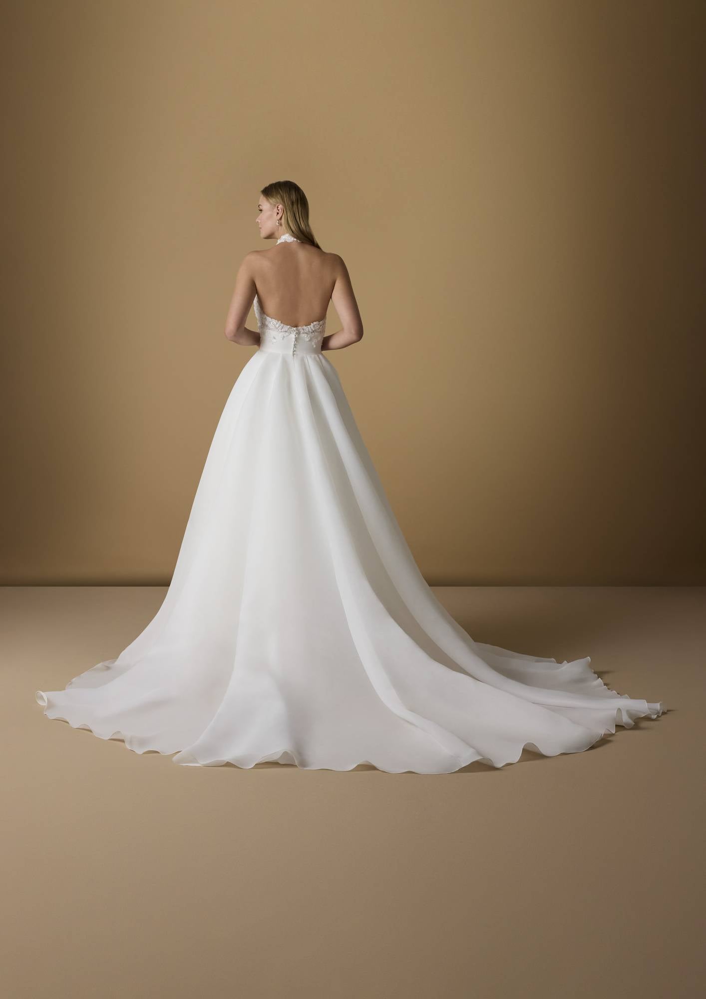 Abito da sposa in organza con corpino prezioso realizzato in pizzo finemente ricamato con scollo all'americana. Un abito moderno e romantico.