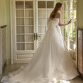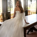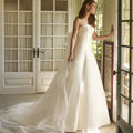 Abito da sposa principessa in mikado con scollo dritto impreziosito da una cascata di cristallini. Completa il look un voluminoso fiocco in organza.