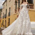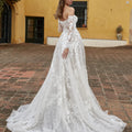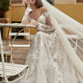 Abito interamente in tulle con corpino steccato semitrasparente a cuore e maniche lunghe di pizzo. La gonna presenta applicazioni floreali e una lunga coda