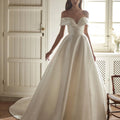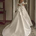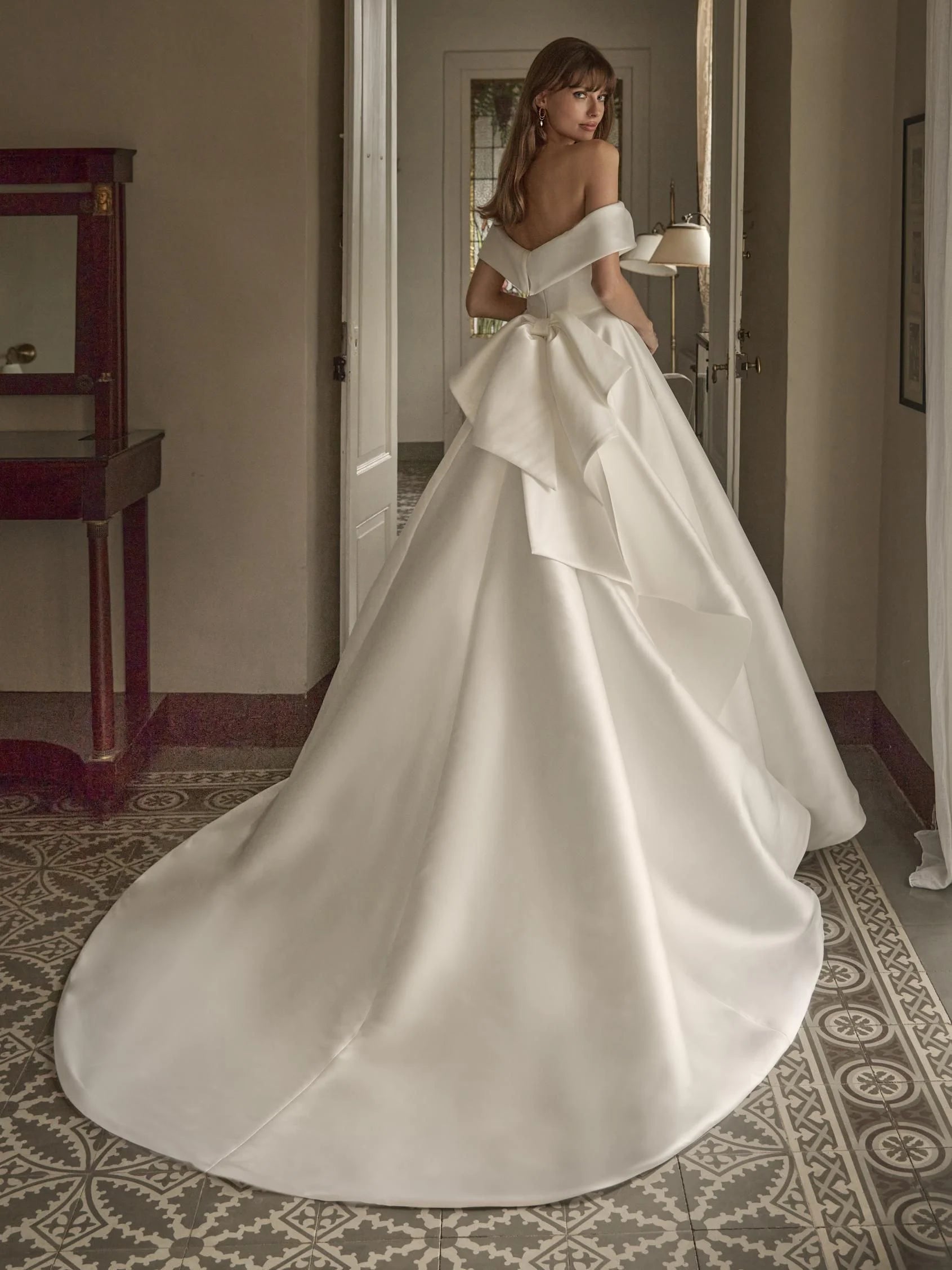Abito in mikado in linea morbida con scollo omerale intrecciato e gonna pulita ampia e fiocco nella parte posteriore