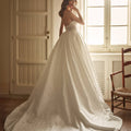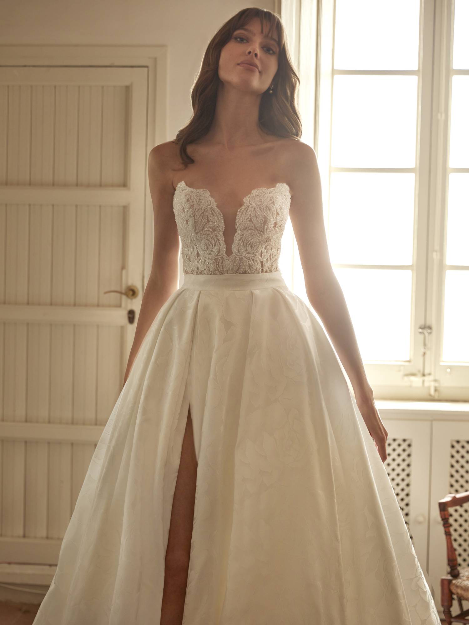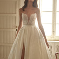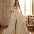 Abito da sposa principessa con scollatura a cuore e spacco laterale. Il corpino è ricamato e finemente lavorato. La gonna ampia è in mikado liscio.