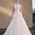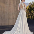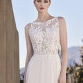 Vestito linea A con scollatura halter, in chiffon, pizzo e chantilly, che evoca una bellezza “fluttuante” ed eterea, ideale per spose che cercano movimento ed eleganza leggera.