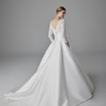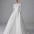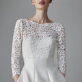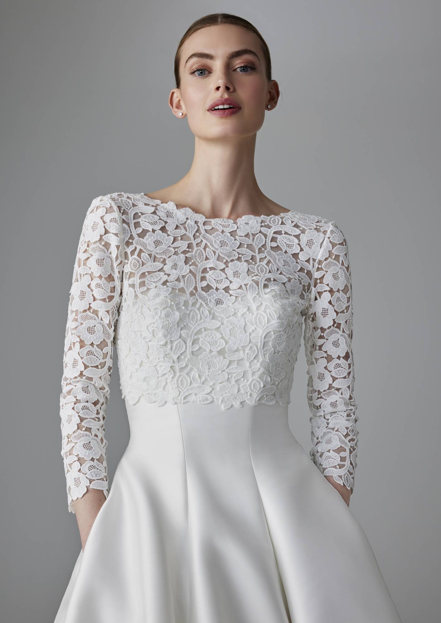 Abito da sposa principessa con scollo a cuore. Completa il look un delicato bolero in pizzo e maniche lunghe scollato sulla schiena.