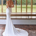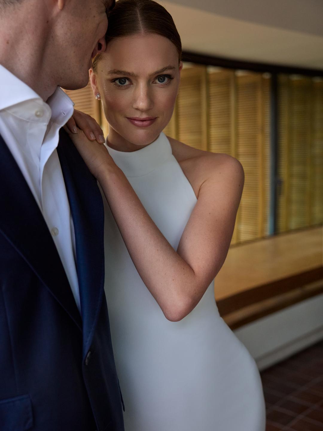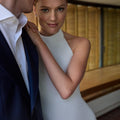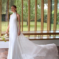 Questo abito a sirena aderente con scollo halter e schiena scoperta si trasforma con un mantello leggero e vaporoso che aggiunge movimento. Il crêpe dona struttura e leggerezza, creando una silhouette che bilancia sensualità e raffinatezza.