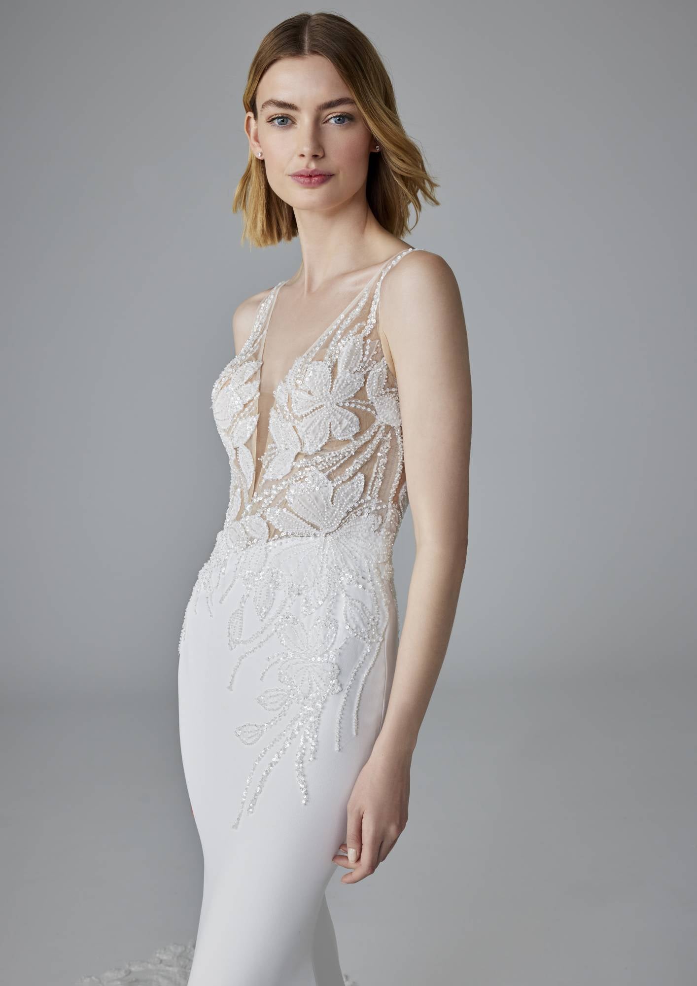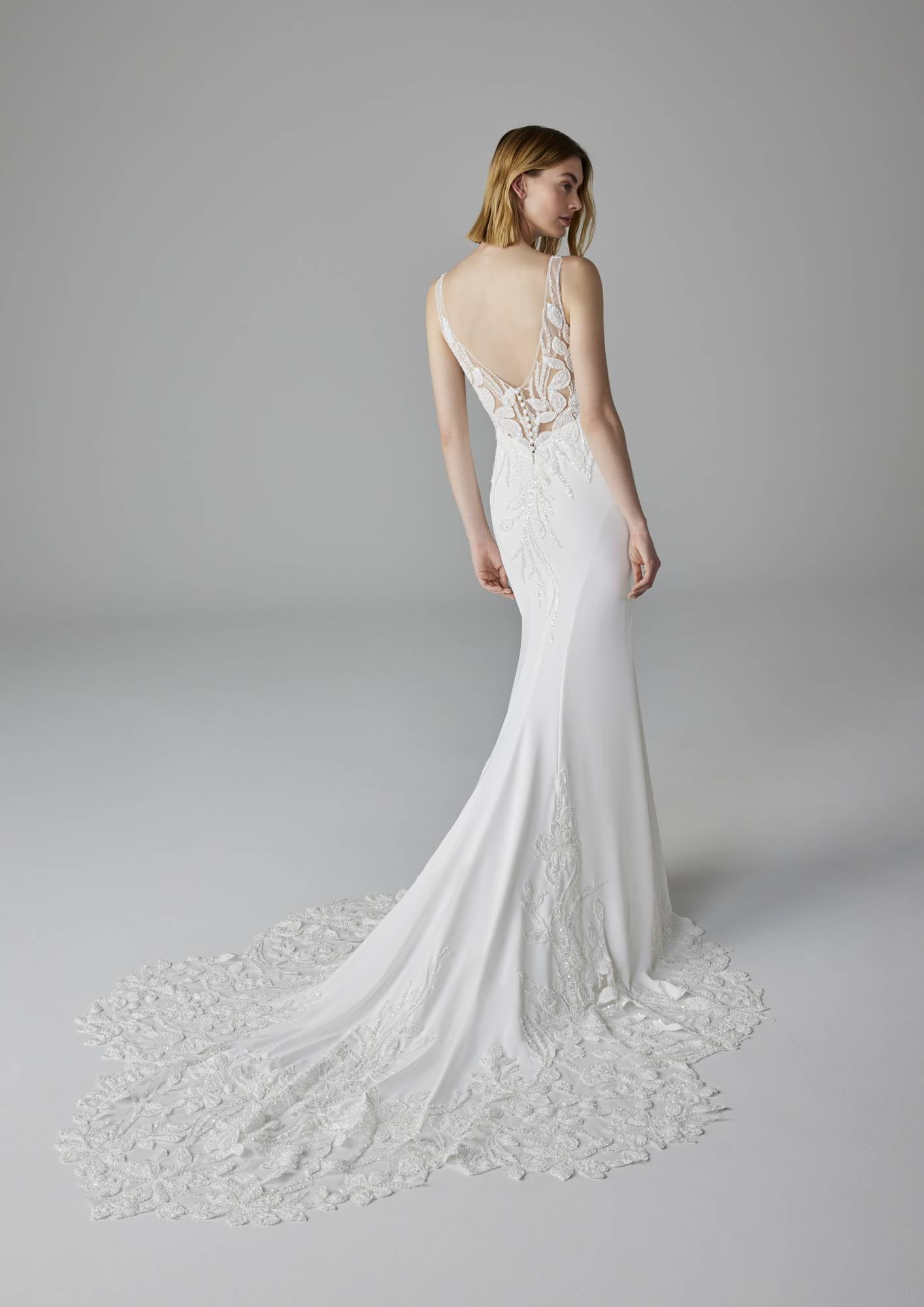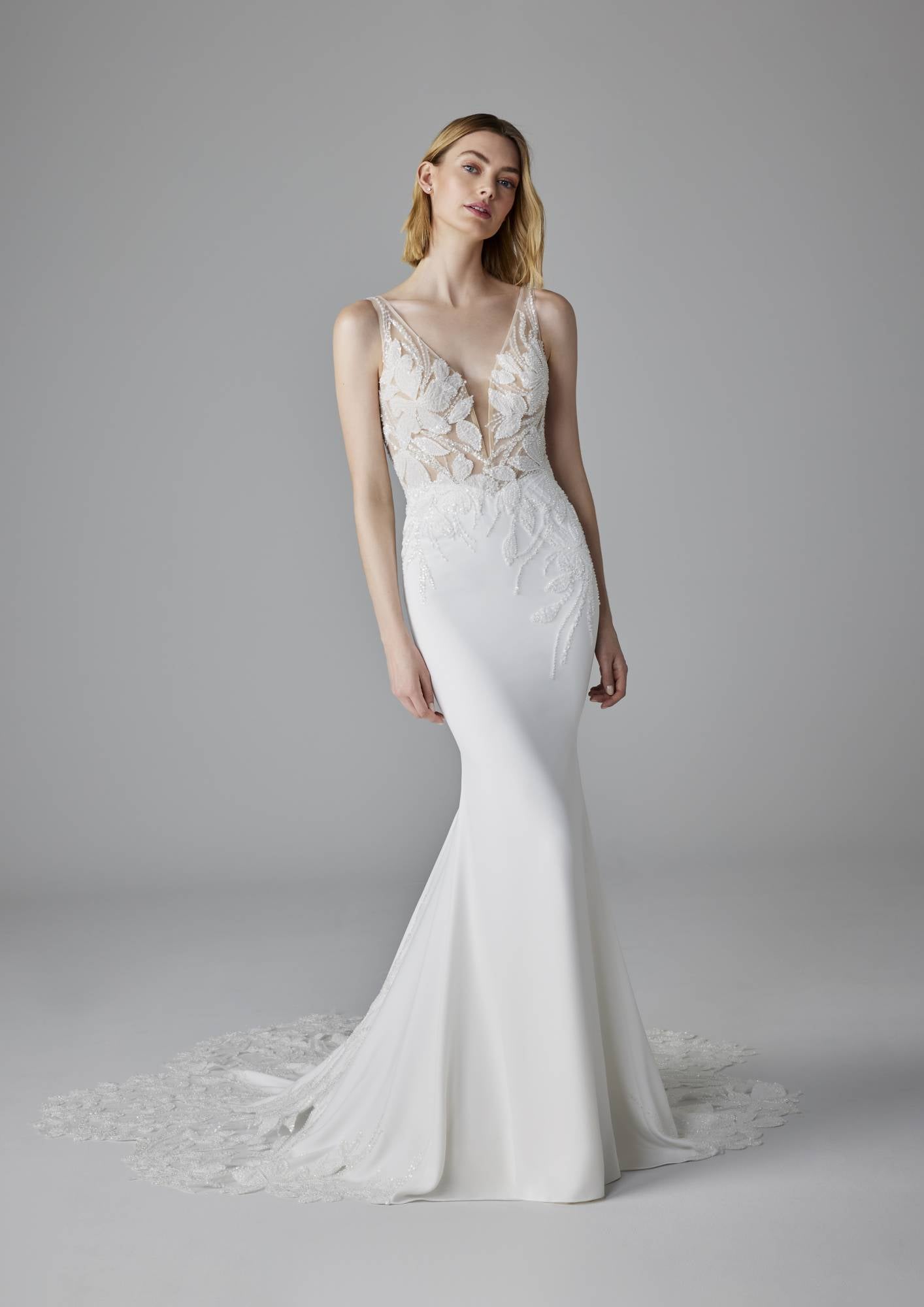 Abito da sposa a sirena con scollo a V, corpino ricamato e gonna in crepe. L'abito è completato da una meravigliosa coda in pizzo.