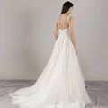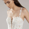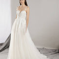 Moderno abito dalla linea semi ampia con corpino steccato e spalline sottili. Il corpino è ricamato mentre la gonna è una nuvola di tulle glitter.