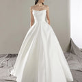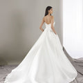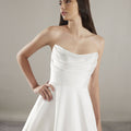 Abito da principessa con corpino e scollo dritto geometrico con drappeggio che evidenzia il punto vita. L'abito è realizzato in mikado, un tessuto che dona regalità al look.