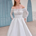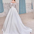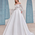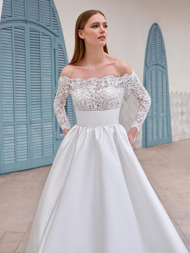 Questo abito principessa con maniche a tre quarti e scollo “off-the-shoulders” unisce struttura e romanticismo. Il corpetto semitrasparente in pizzo si fonde con una gonna voluminosa in mikado morbido, creando una silhouette maestosa con dettagli che brillano delicatamente grazie alle perline.