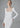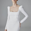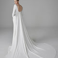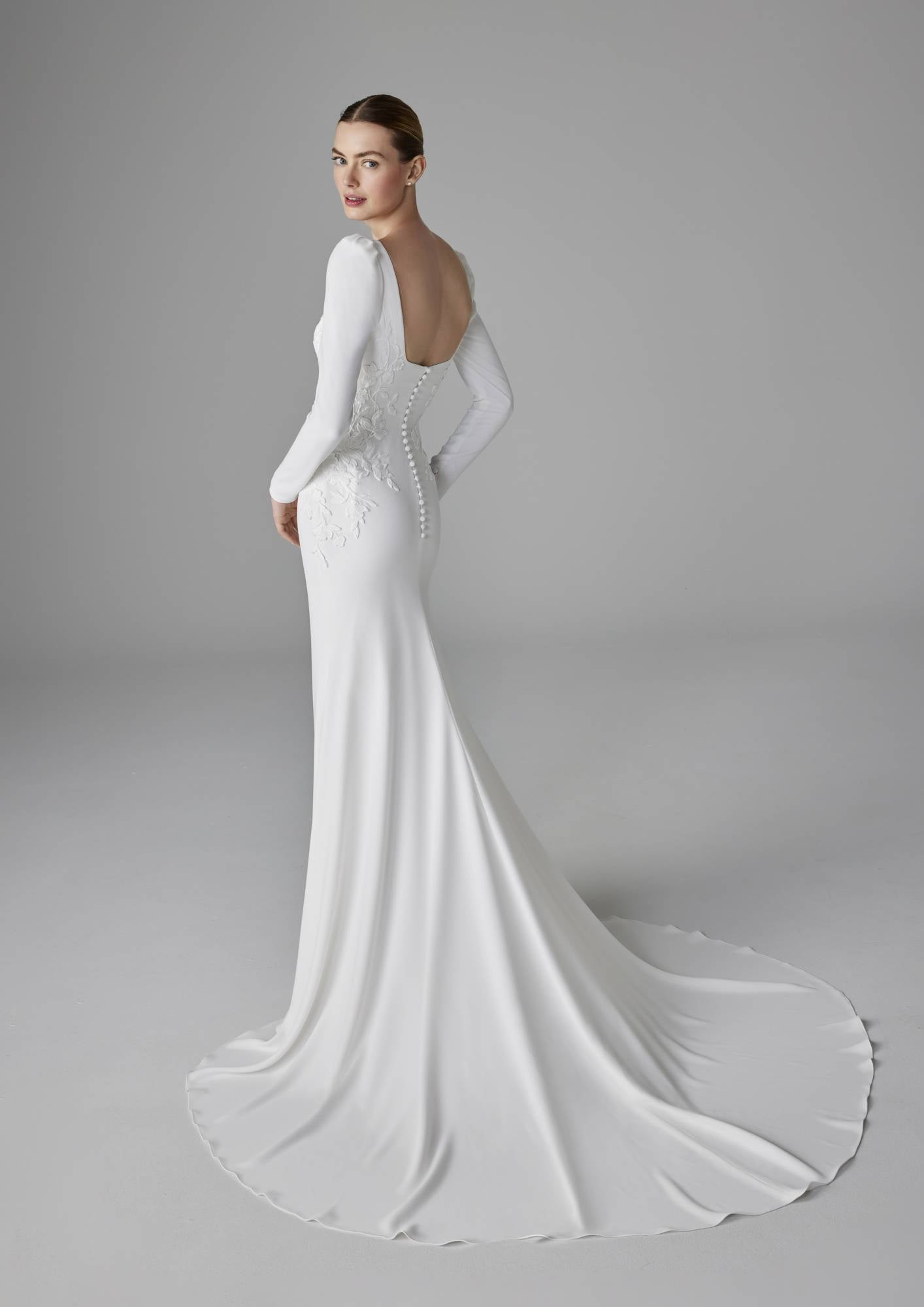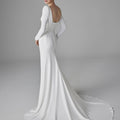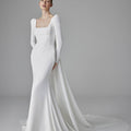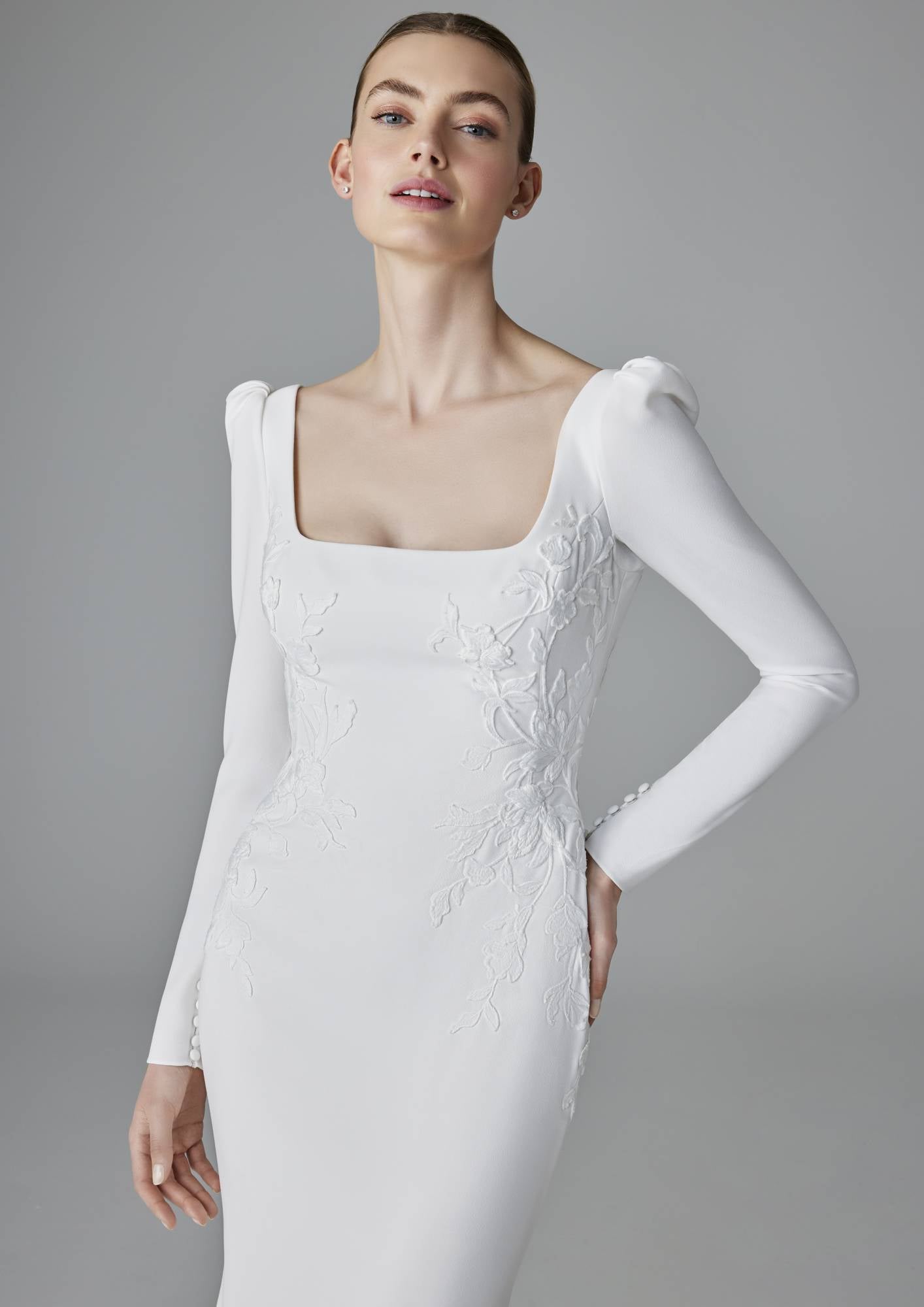 Abito da sposa in crepe con maniche lunghe e scollo quadrato. Il modello è impreziosito da applicazioni di pizzo che corrono lungo i fianchi. Completa il look una coda in crepe rimovibile.