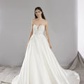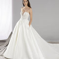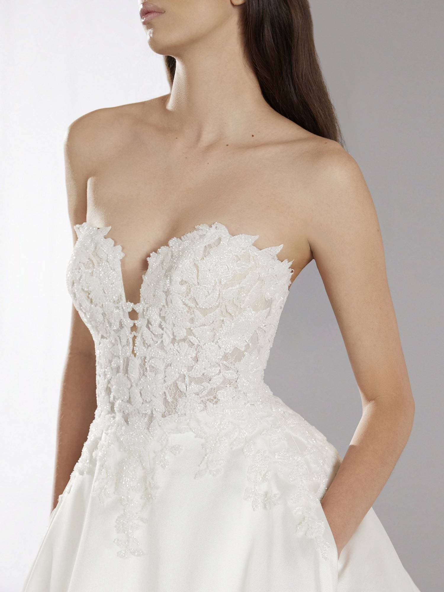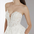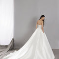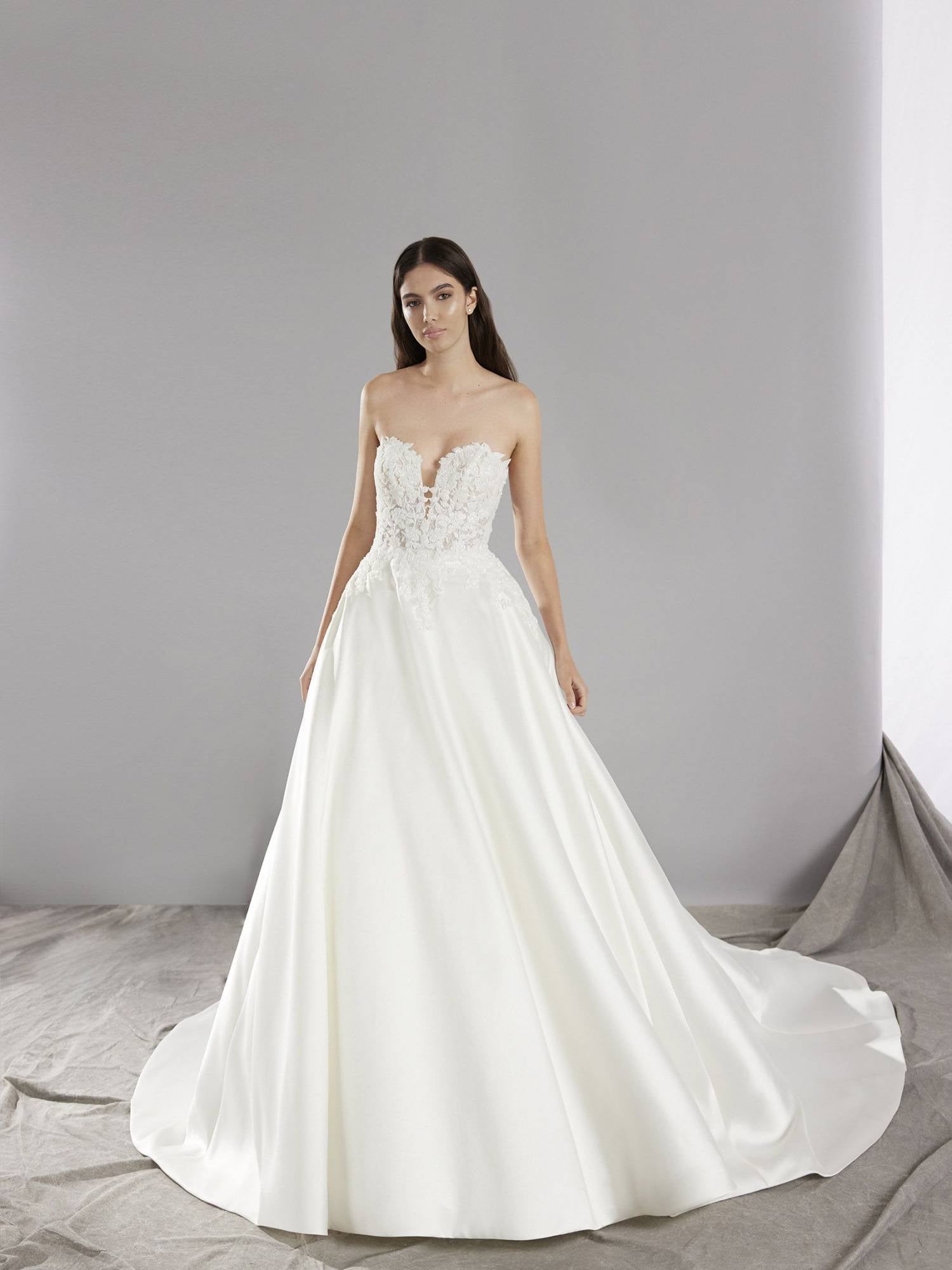 Abito principesco in mikado con ampia gonna e corpino ricamato e realizzato in pizzo. Lo scollo a cuore dona un tocco romantico all'abito.