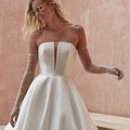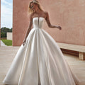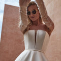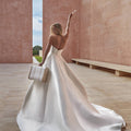 Abito principessa in mikado con scollo dritto geometrico e schiena scollata.