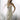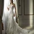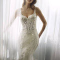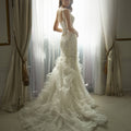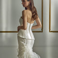 Abito da sposa a sirena composto da due pezzi: top effetto corsetto con vita a V e spalline, realizzato in pizzo e ricamo prezioso, abbinato ad una gonna strutturata con ruches in organza e pizzo a cascata.