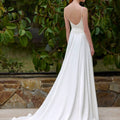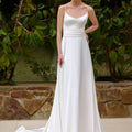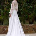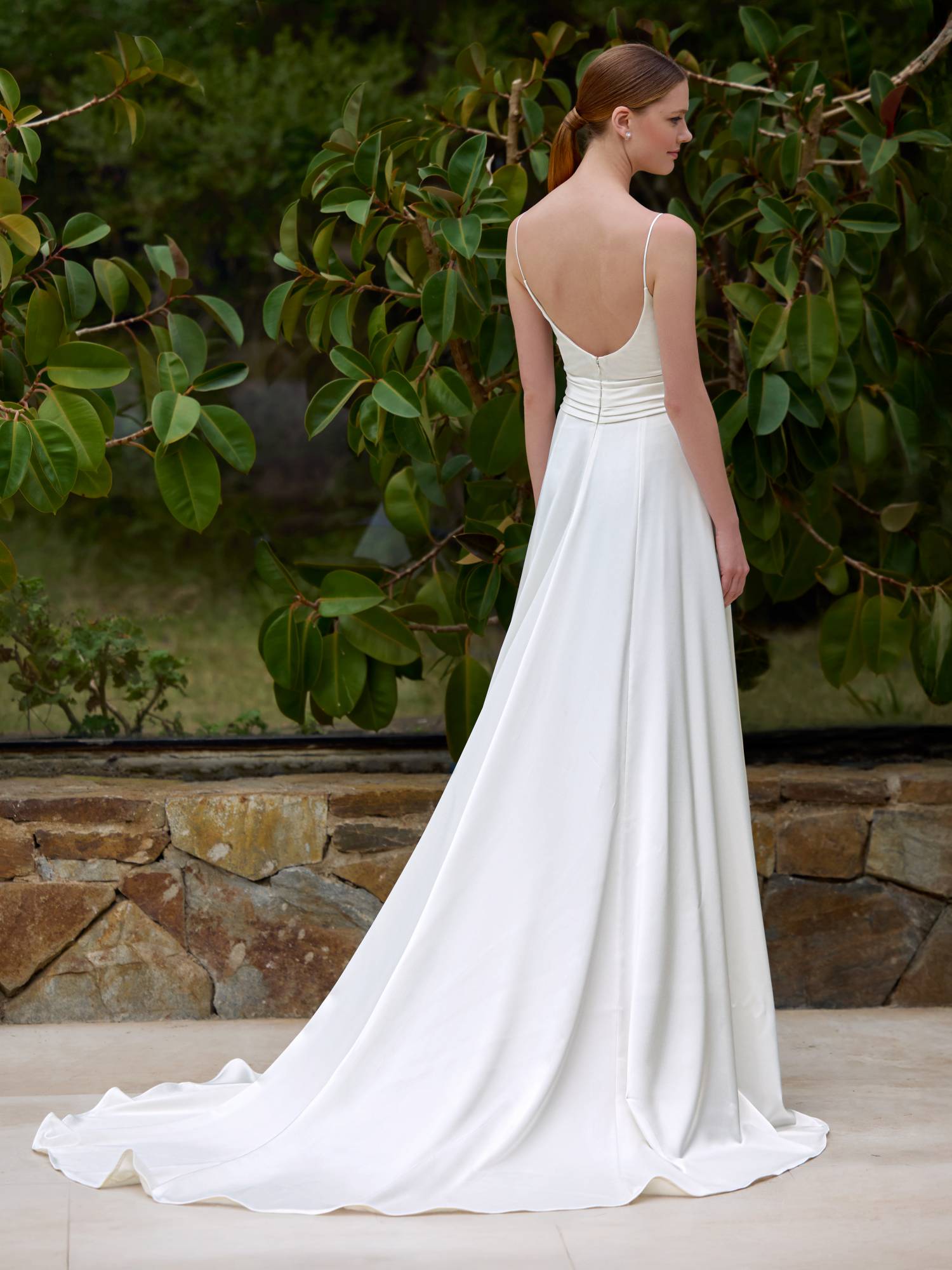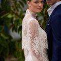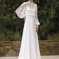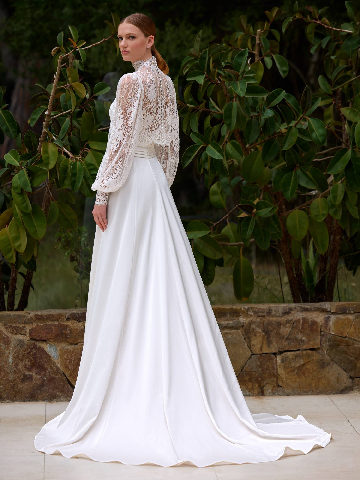 Abito da sposa scivolato in satin con spalline sottili e cinta drappeggiata. L'abito è abbinato ad un coprispalle dal gusto retrò con maniche lunghe a palloncino e colletto alto.