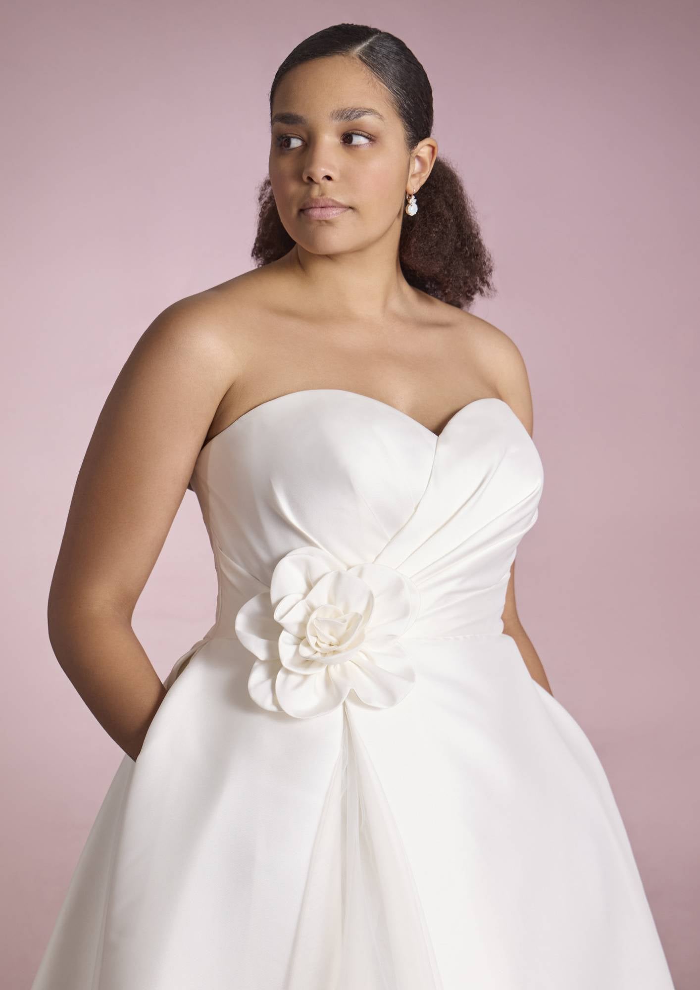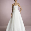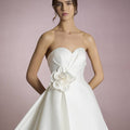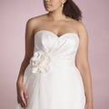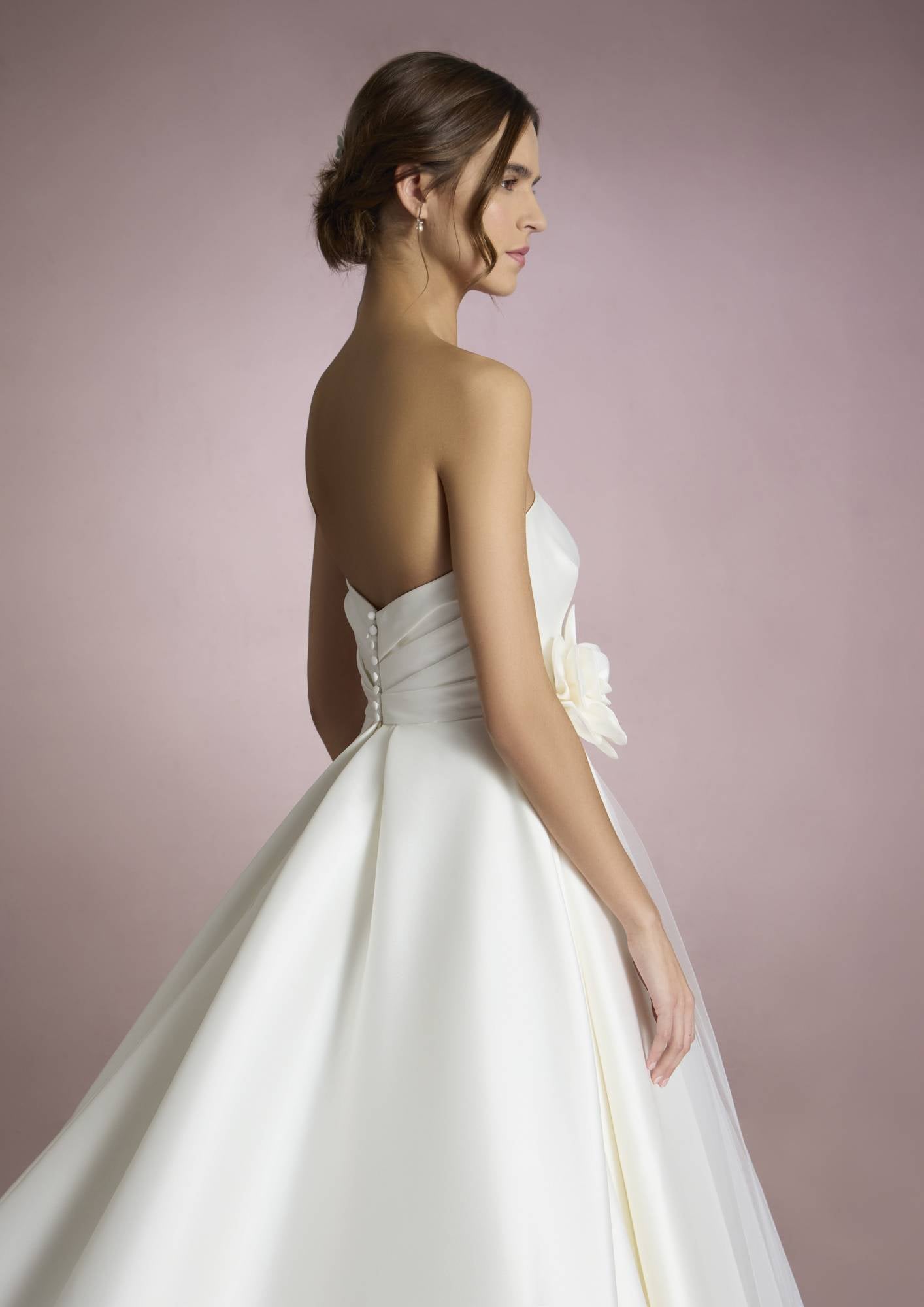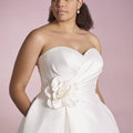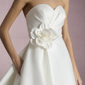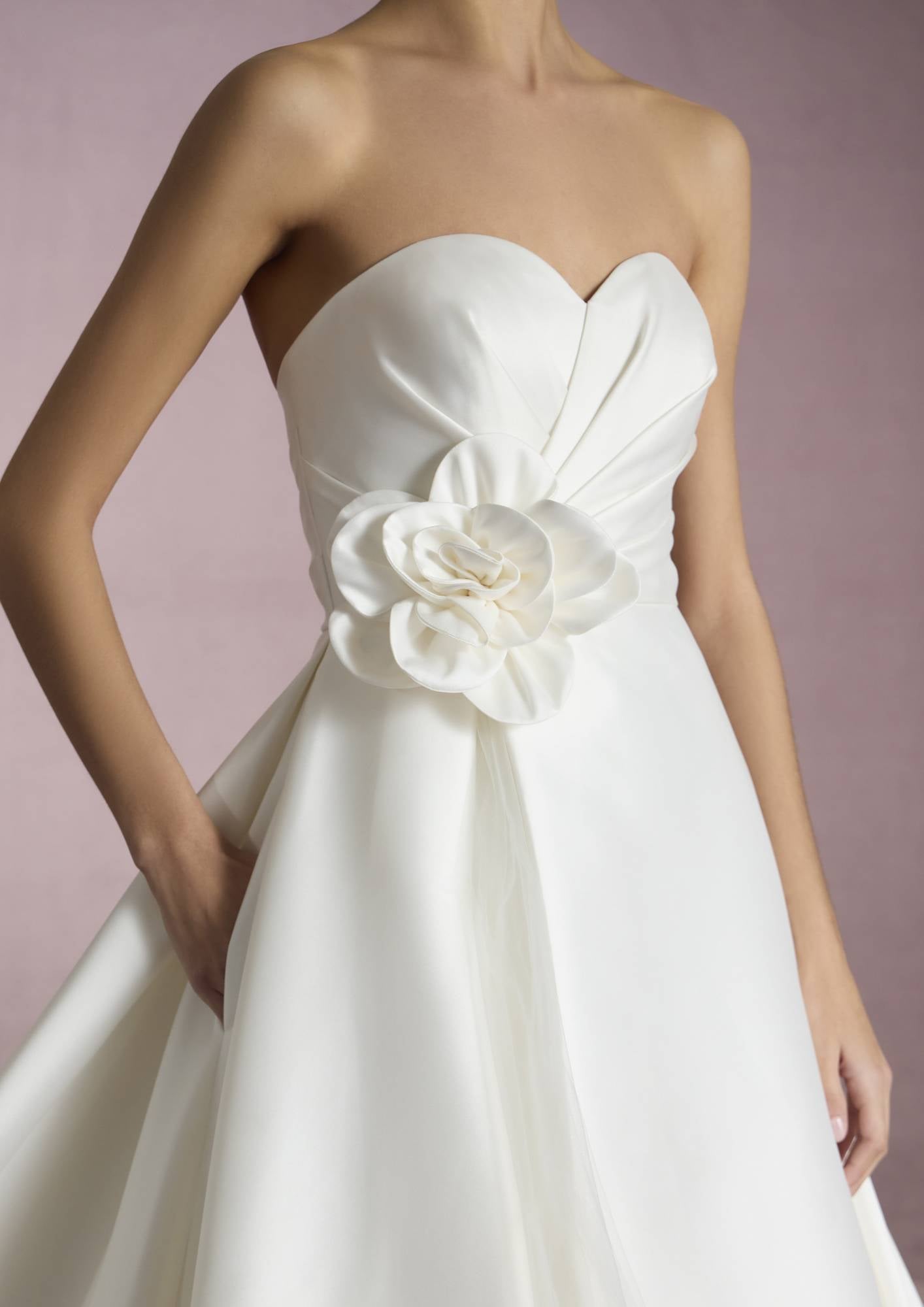 Abito principessa in mikado con scollo a cuore e corpino drappeggiato con fiore laterale ad impreziosire il punto vita.
