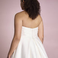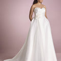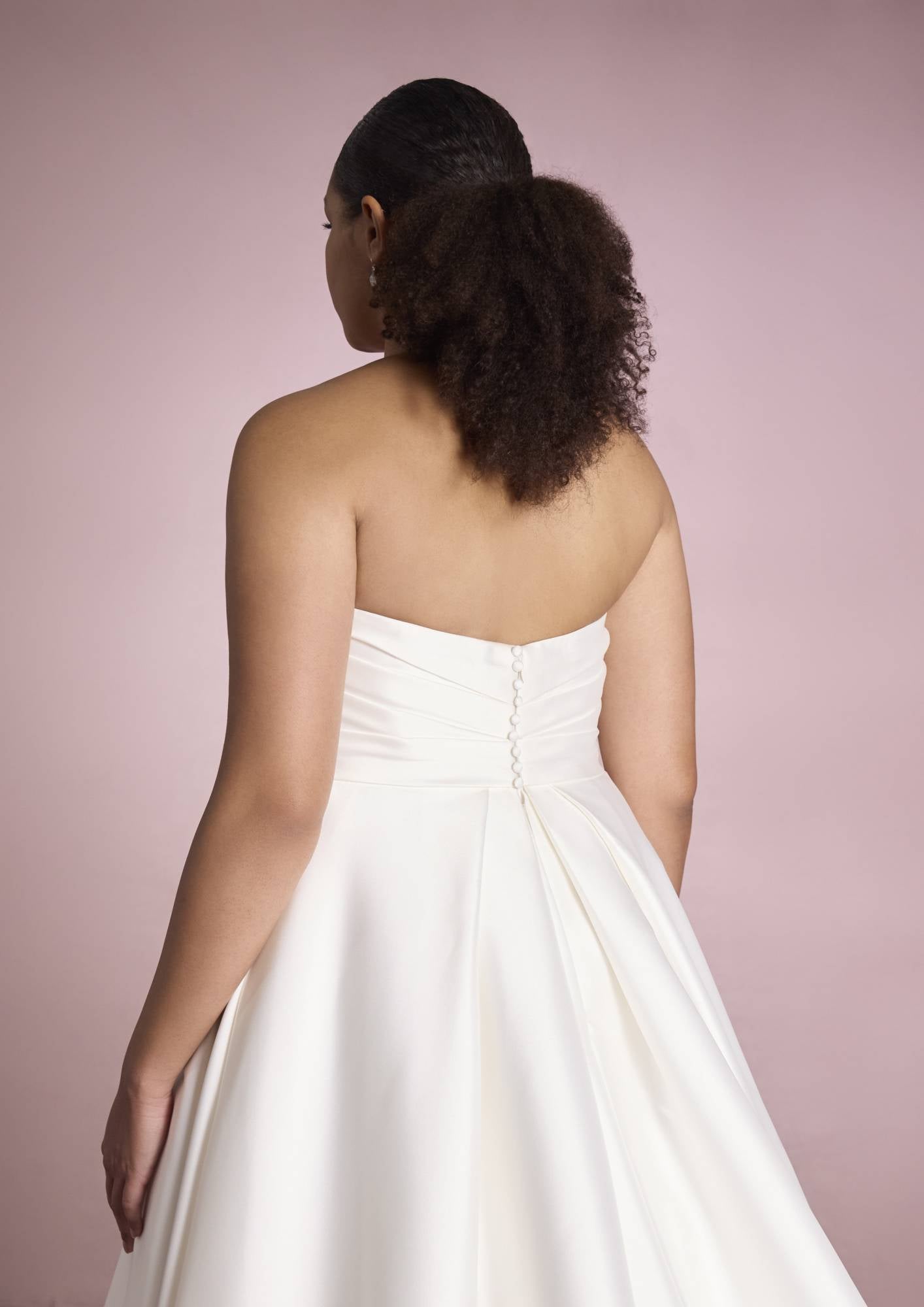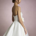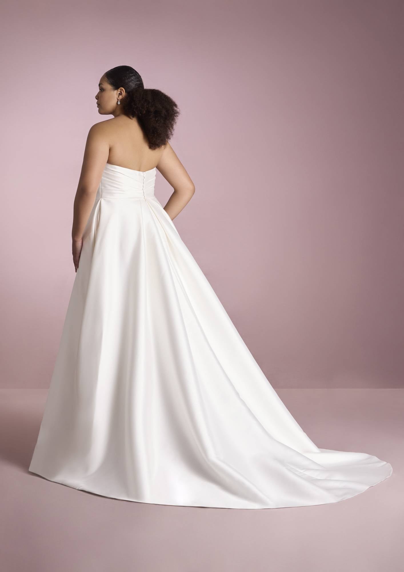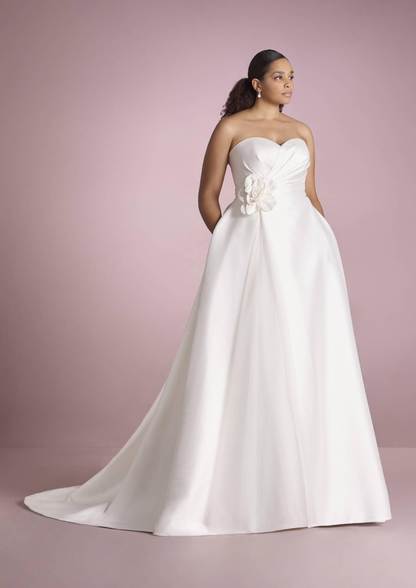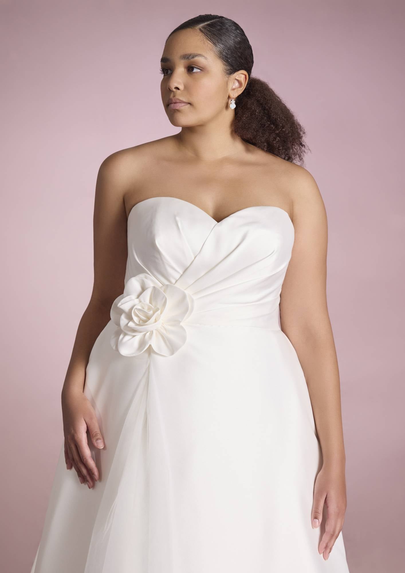 Abito principessa in mikado con scollo a cuore e corpino drappeggiato con fiore laterale ad impreziosire il punto vita.