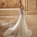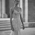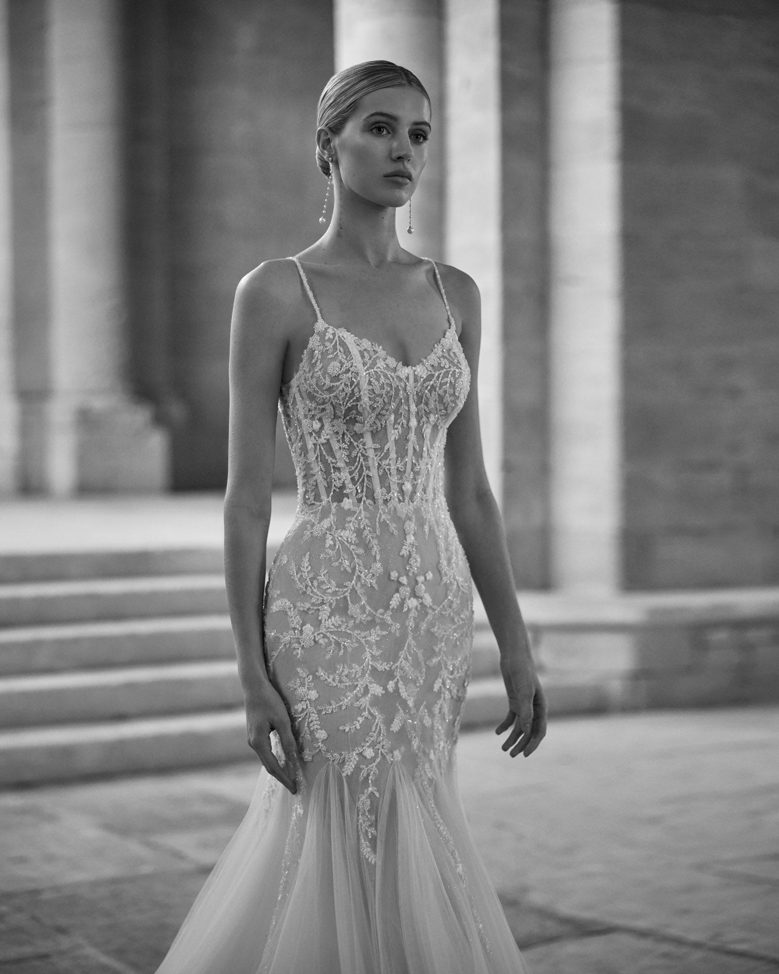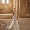Abito a sirena nude con scollo a cuore e corpino steccato ricoperto da pizzo, cristalli e due sottili bretelline gioiello. Le decorazioni scendono delicate a cascata anche sulla gonna in tulle