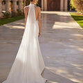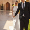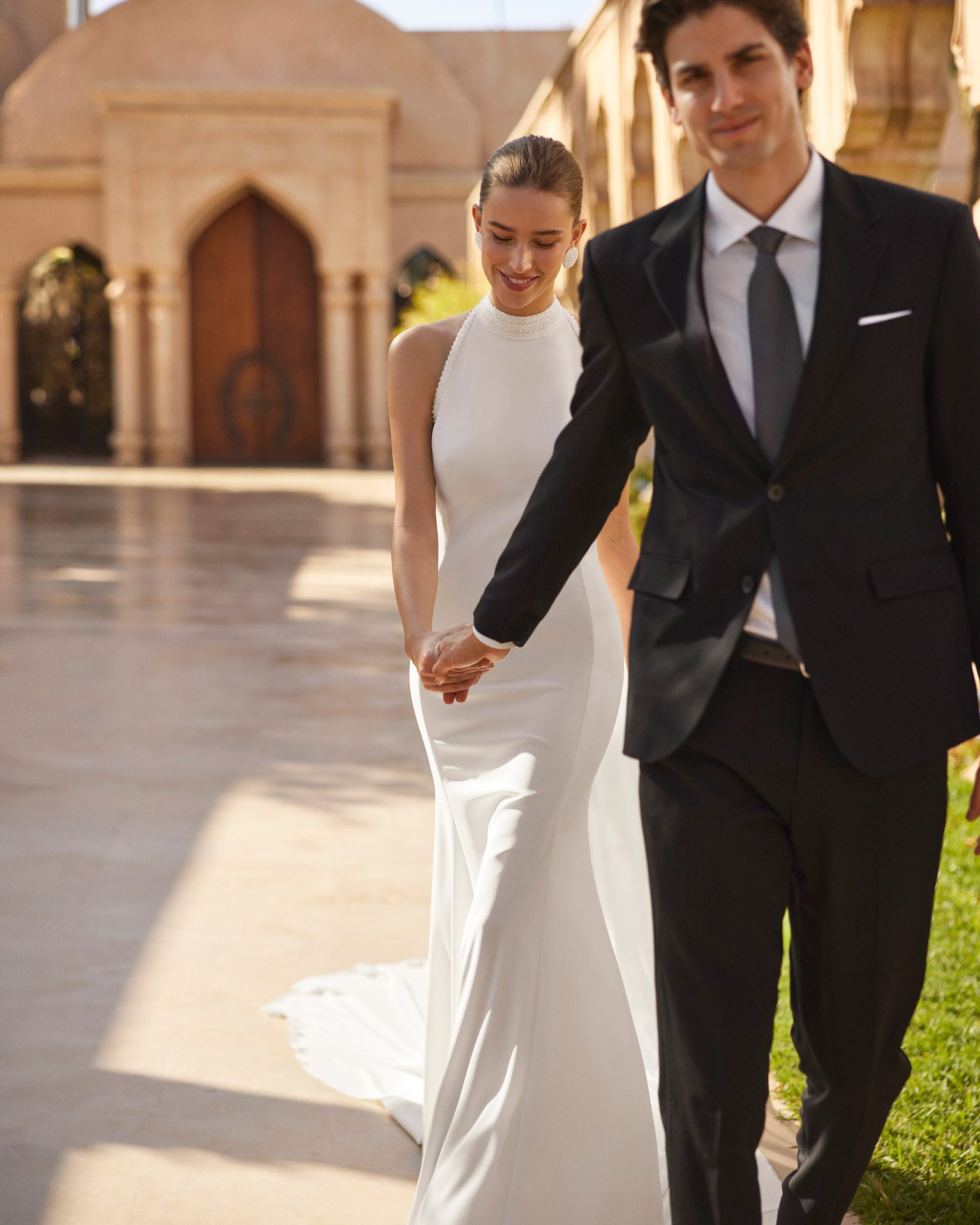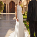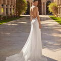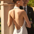 Abito a sirena linea pulita con scollo all'americana e profonda scollatura sulla schiena interamente rifinita da cristalli. L'ala in tulle staccabile sulla schiena dona all'abito estrema sensualità ed un effetto secondo look