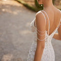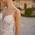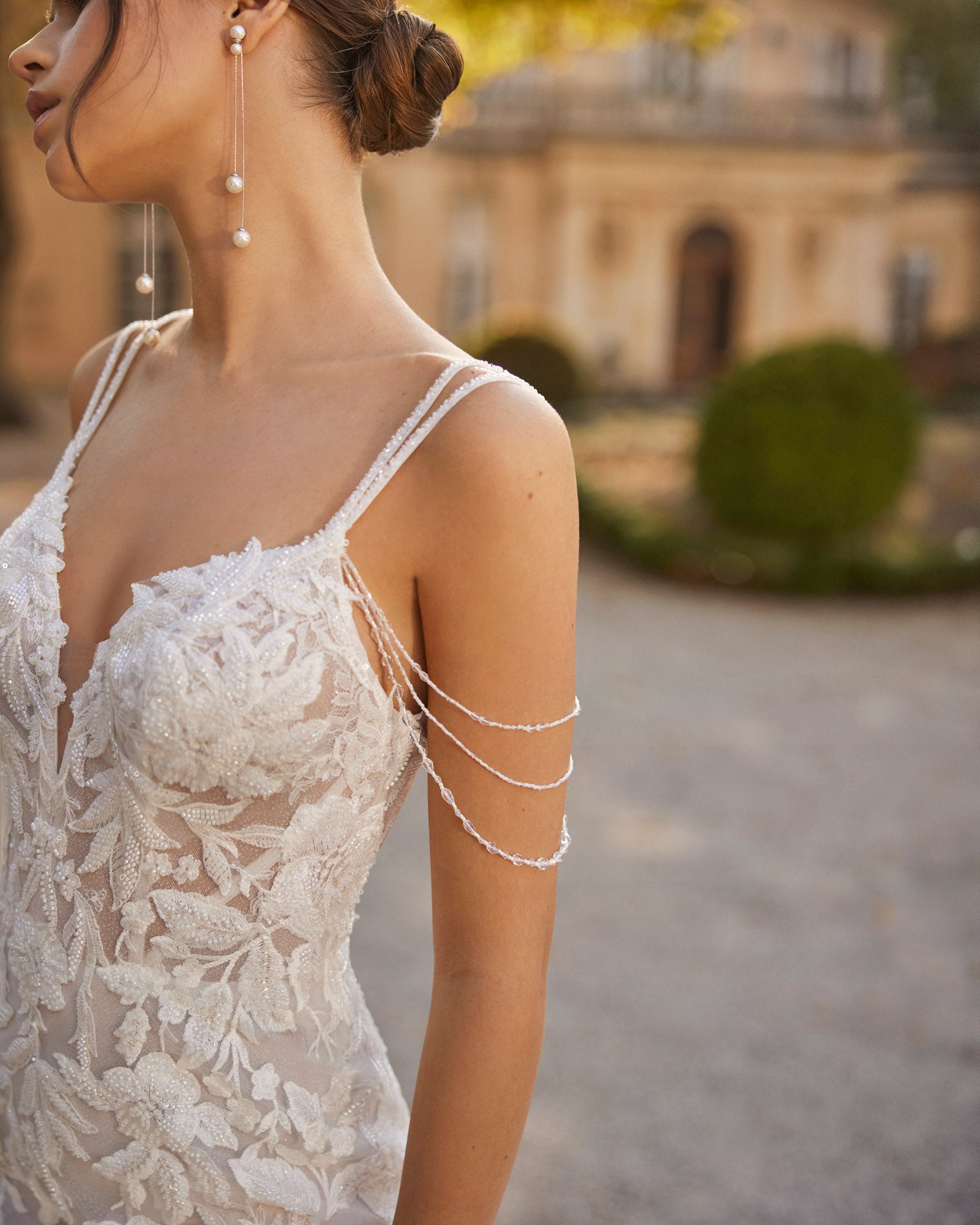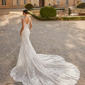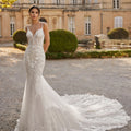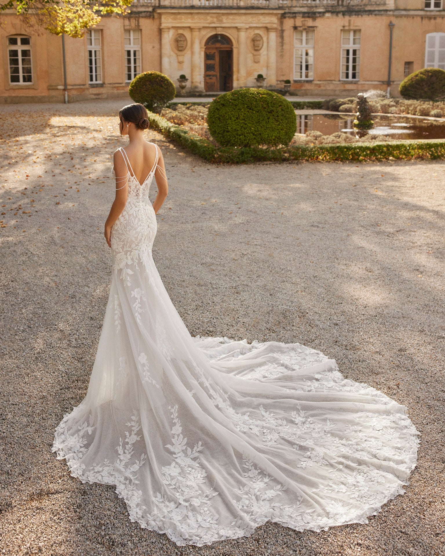 Abito da sposa a sirena con scollo a cuore e corpino semitrasparente con applicazioni di pizzo floreali che continuano morbide sulla gonna e riprendono su tutta la coda