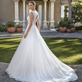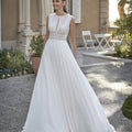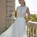 Abito in chiffon con pizzo e perline, con silhouette a linea A. Lo scollo a barca e la schiena profonda offrono un perfetto equilibrio tra classico e moderno, ideale per una sposa dal gusto raffinato.