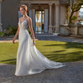 Questo abito combina chiffon, tulle, pizzo e perline in una silhouette a linea A. Lo scollo a V e la schiena profonda creano una linea fluida ed elegante—perfetta per una cerimonia all’aperto o urbana.