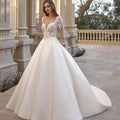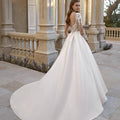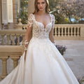 Abito in mikado con tulle, pizzo e ricami. La linea ad A e la scollatura a cuore si uniscono a maniche lunghe per un’immagine elegante e senza tempo.