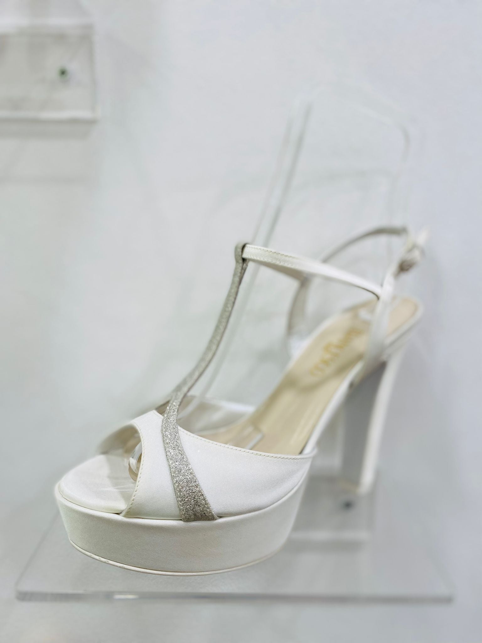 Il sandalo da sposa Pantelleria Annalisa 9626 è la scelta d’elezione per chi sogna un ingresso trionfale all'insegna dell'altezza e della ricercatezza sartoriale. Realizzato in un pregiato satin avorio, questo modello cattura l'essenza dell'eleganza classica, offrendo una lucentezza setosa che si sposa divinamente con abiti in mikado, cady o pizzo tradizionale. La struttura del sandalo è definita da un gioco di incroci sulla parte anteriore, impreziositi da una fascetta centrale a T (T-strap) che non solo slancia otticamente la figura, ma garantisce una tenuta impeccabile del piede durante ogni fase del grande giorno. Il design è dominato da un tacco alto 10 cm, che tuttavia non sacrifica la vestibilità: la forma del tacco è studiata per essere mediamente larga, offrendo una base di appoggio più sicura rispetto a un classico spillo. A bilanciare l'altezza interviene un importante plateau anteriore, che riduce drasticamente l'inclinazione del piede, permettendo di indossare questa calzatura con disinvoltura per molte ore. Il cinturino alla caviglia regolabile assicura una stabilità totale, avvolgendo il tallone con delicatezza e precisione. Come per ogni nostra proposta, è possibile richiedere la personalizzazione del modello per renderlo unico: contattaci per scoprire come adattare questa creazione al tuo stile.