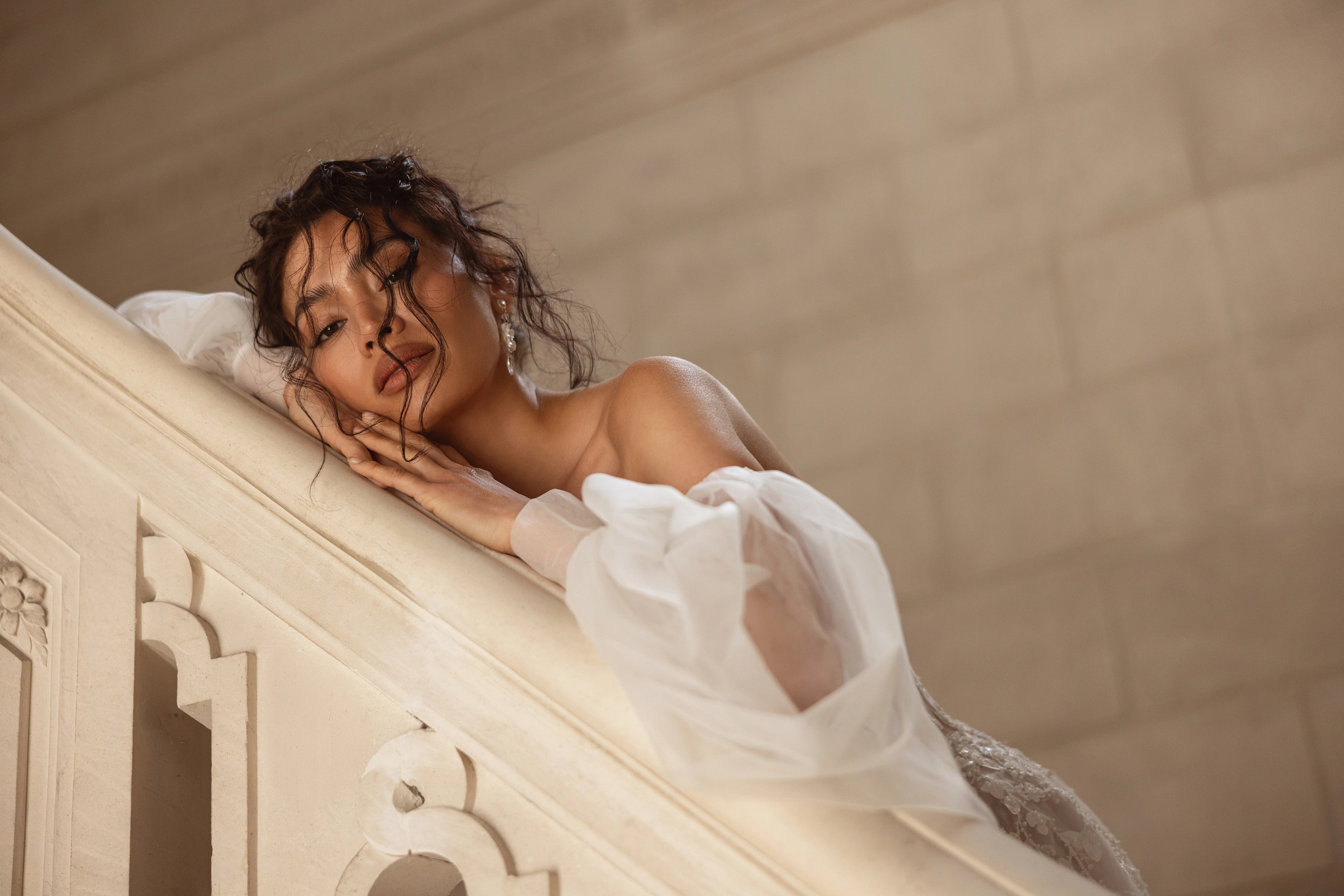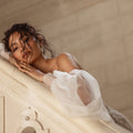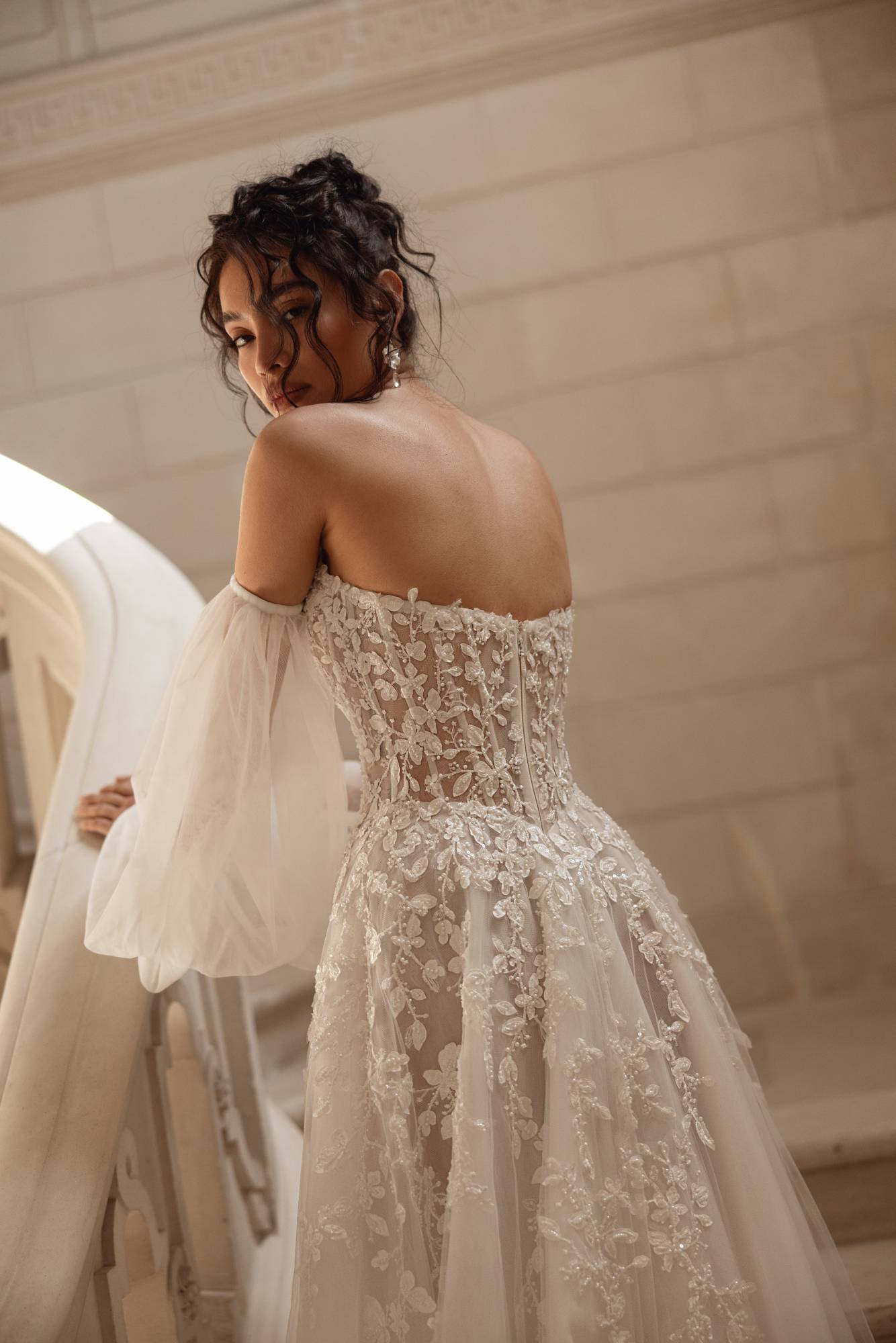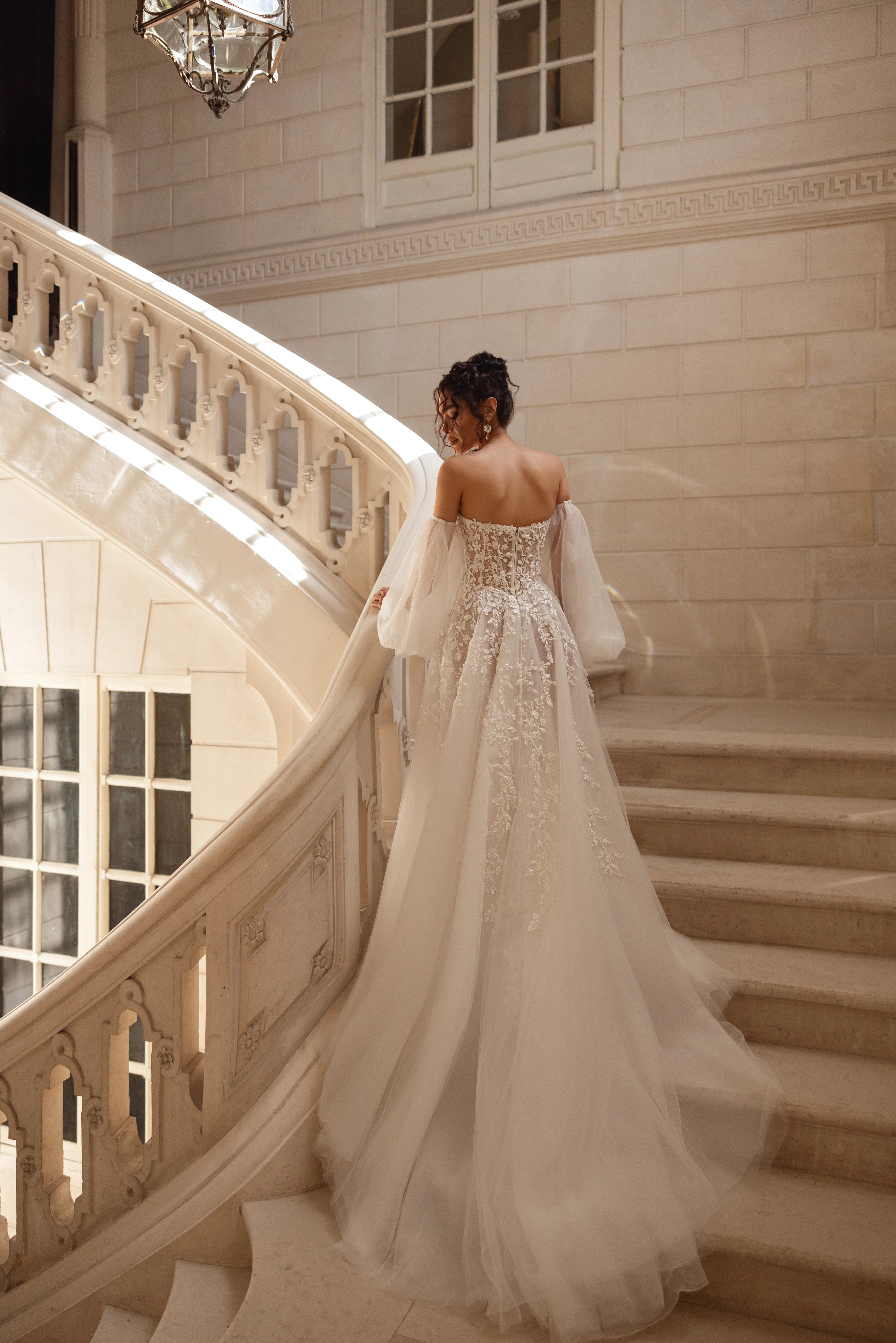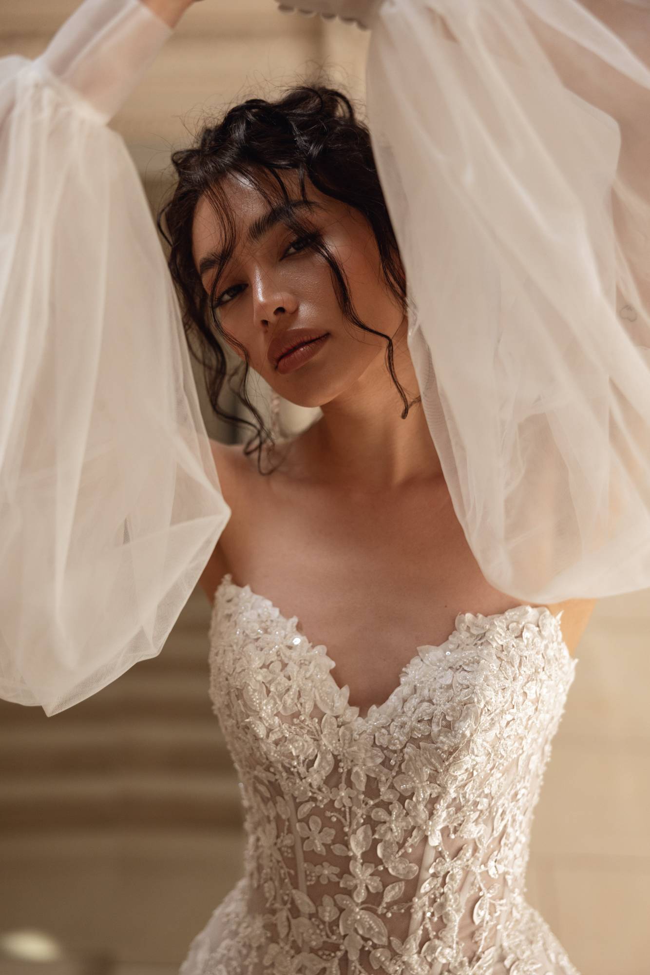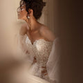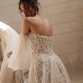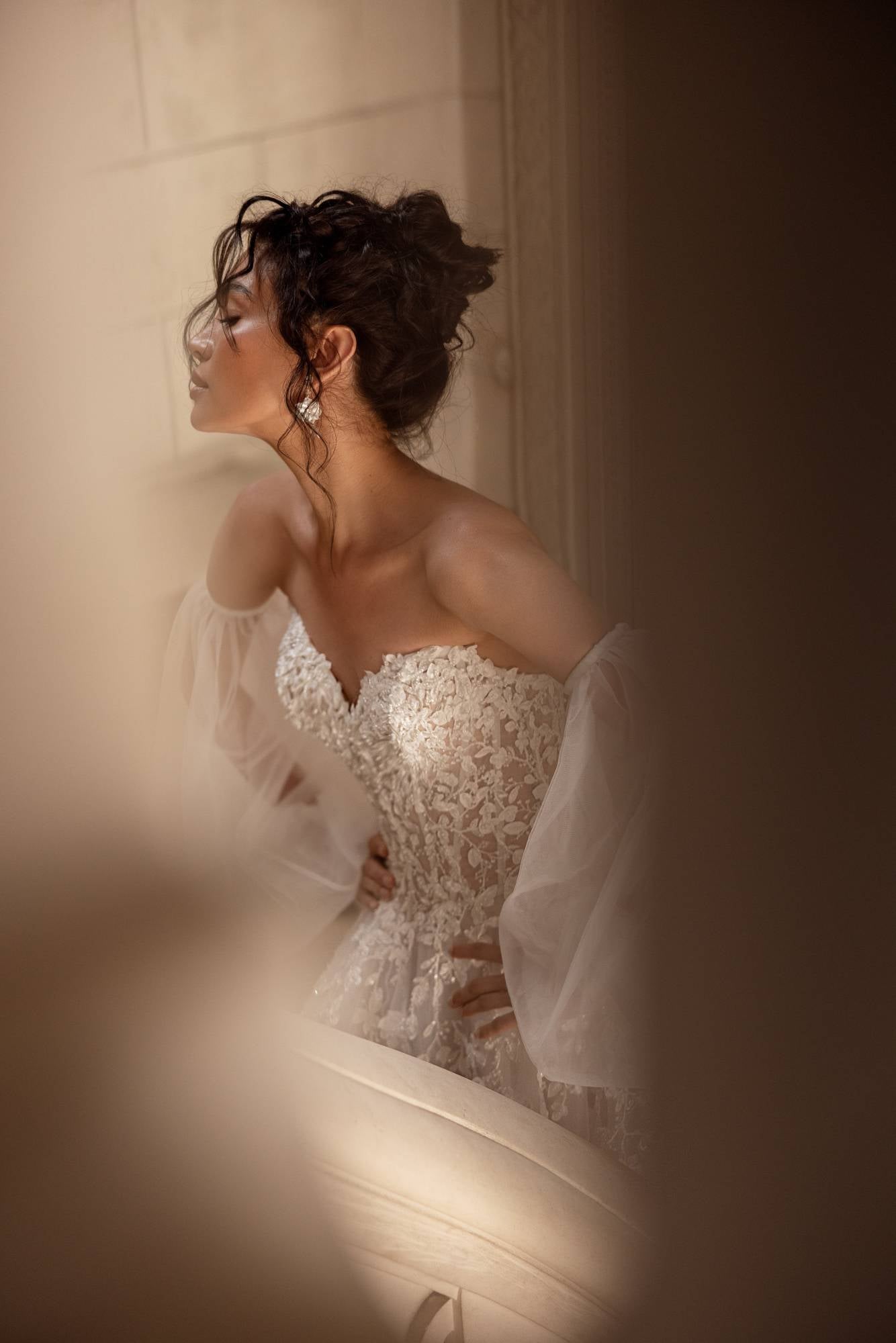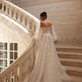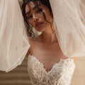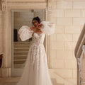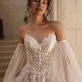 Abito da sposa dalla gonna semi ampia in tulle e pizzo luminoso. Il corpino scollato a cuore è abbinato a vaporosi manicotti in tulle.