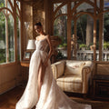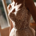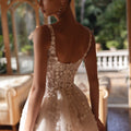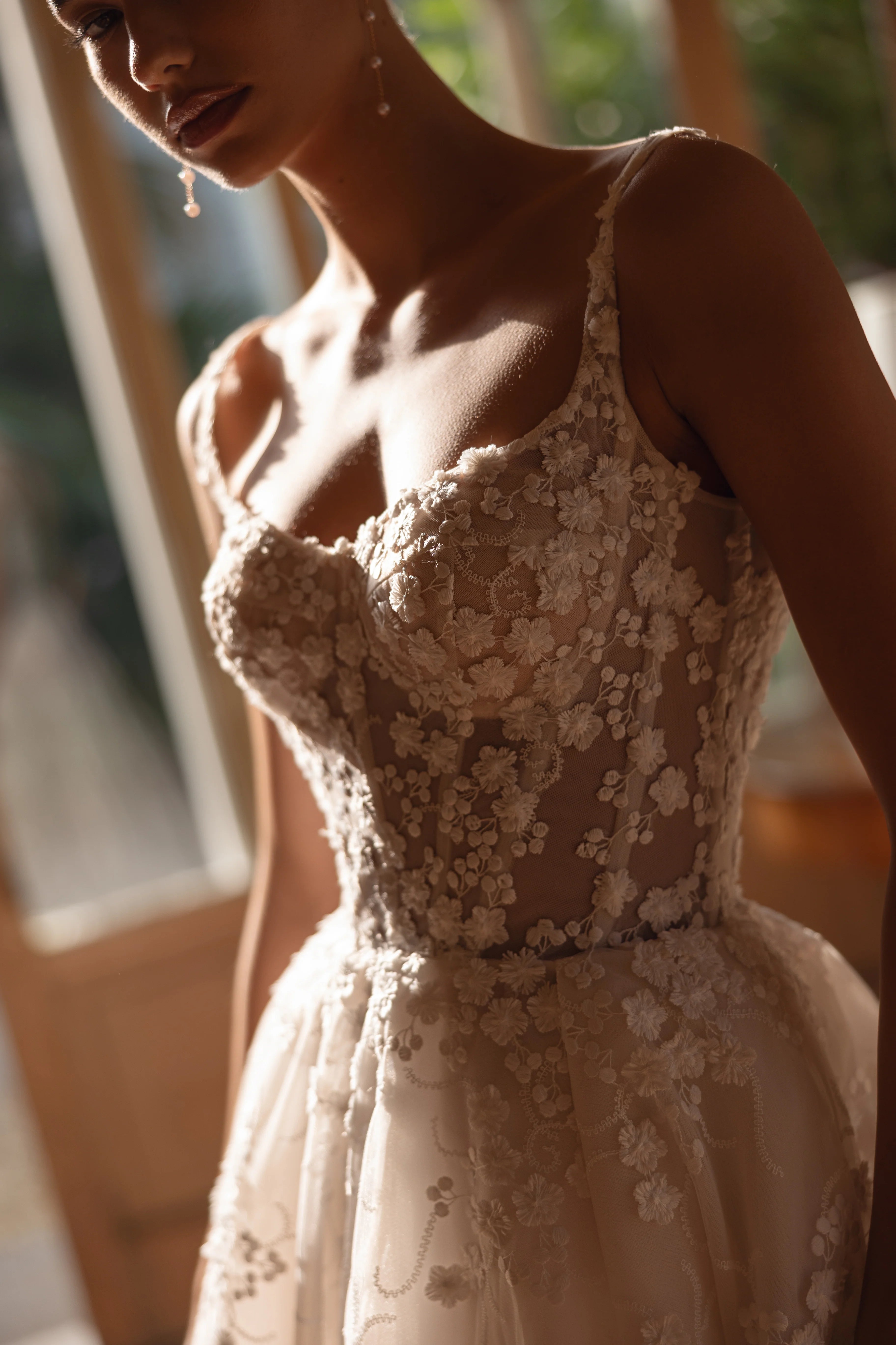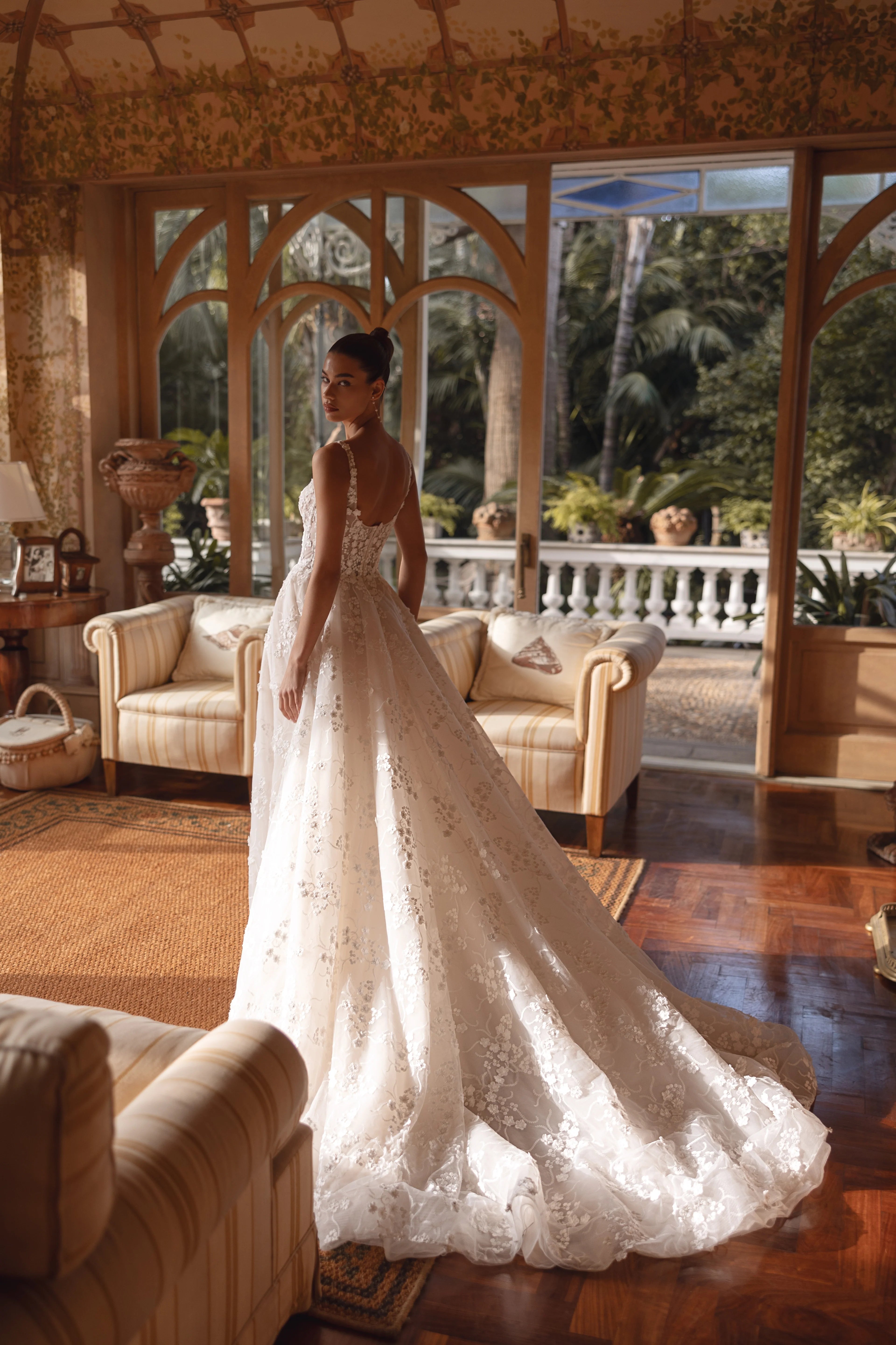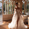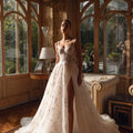 Abito da sposa romantico, dalla gonna scivolata. L'abito è interamente realizzato in pizzo floreale delicato. Il corpino è scollato dritto con sottili spallini rifinite che lasciano la schiena scoperta. Completa il look un sensuale e profondo spacco laterale.