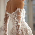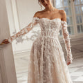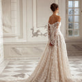 Abito da sposa romantico, dalla linea ad A, con scollo dritto e maniche lunghe. L'abito è interamente realizzato in tulle e pizzo ricamato floreale.
