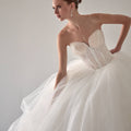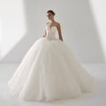 Ampio abito da principessa con gonnellone in tulle, vaporosa e romantica, abbinato ad un corpino che è vero gioiello: interamente realizzato con ricamo prezioso di cristallini, scollatura a cuore e punto vita a V.