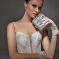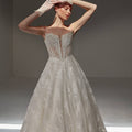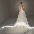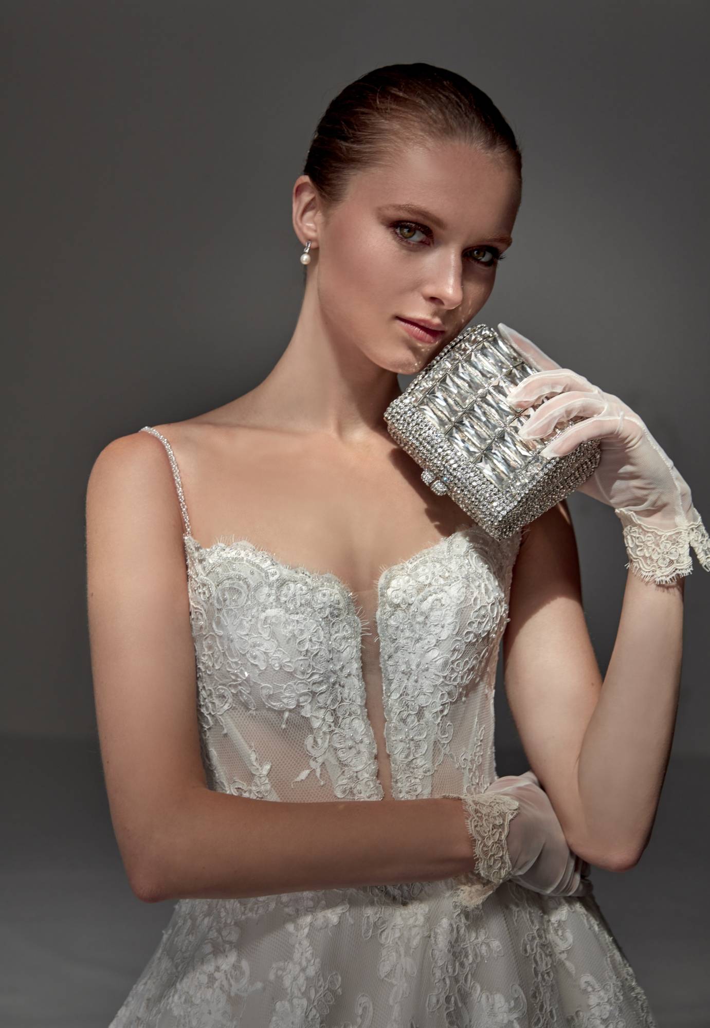 Abito da sposa ampio da principessa con scollo a v en spalline sottili e ricamo luminoso. La vita a V esalta il punto vita slanciando la figura. L'abito è interamente realizzato in pizzo rebrodè, delicato e sofisticato.