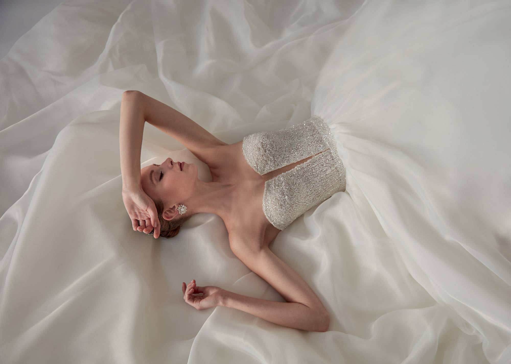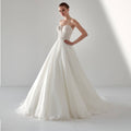 Abito da sposa ampio da principessa in organza con corpino gioiello scollato a cuore.