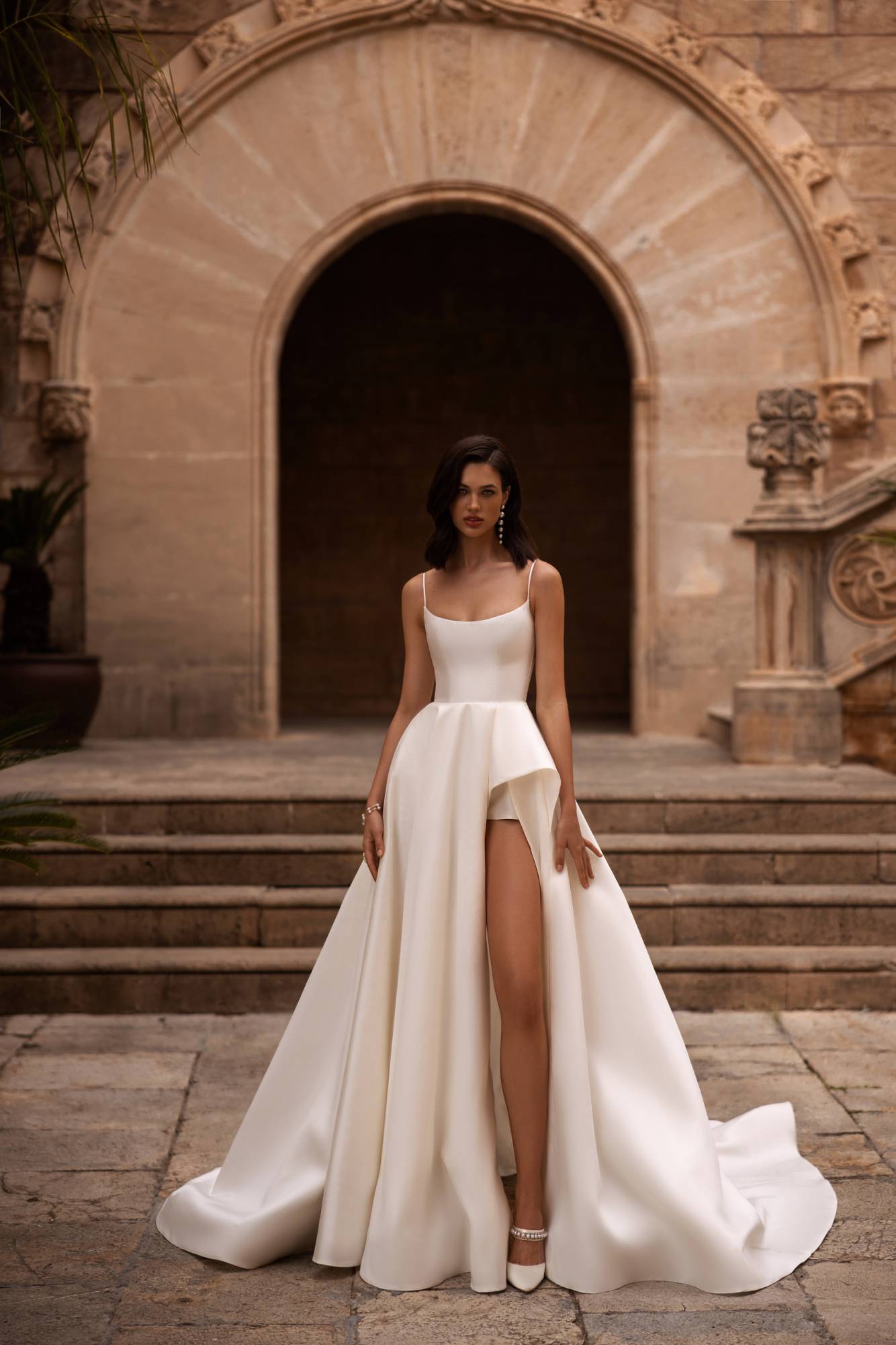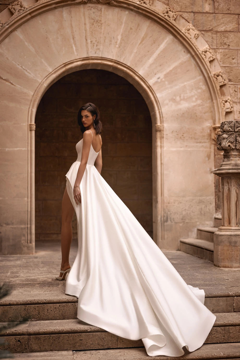 Elegante e sofisticato abito dalla linea ad A. Il corpino è minimal ed elegante, con scollo dritto e spalline sottili. Il punto forte di questo modello è la gonna asimmetrica che lascia scoperta la gamba, aggiungendo un elemento di fascino inaspettato.