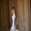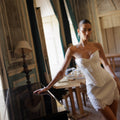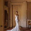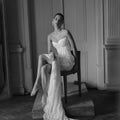 Abito trasformabile composto da corsetto, minigonna e gonna lunga a sirena. Il corsetto è realizzato con scollo a cuore geometrico, stecche e ricamo pòrezioso di cristalli e perline, chiusura con stringhe sulla schiena. Abbinato al corpetto la minigonna in raso e la gonna lunga a sirena dello stesso tessuto, con lo stesso ricamo del corpino che scende lungo i fianchi,